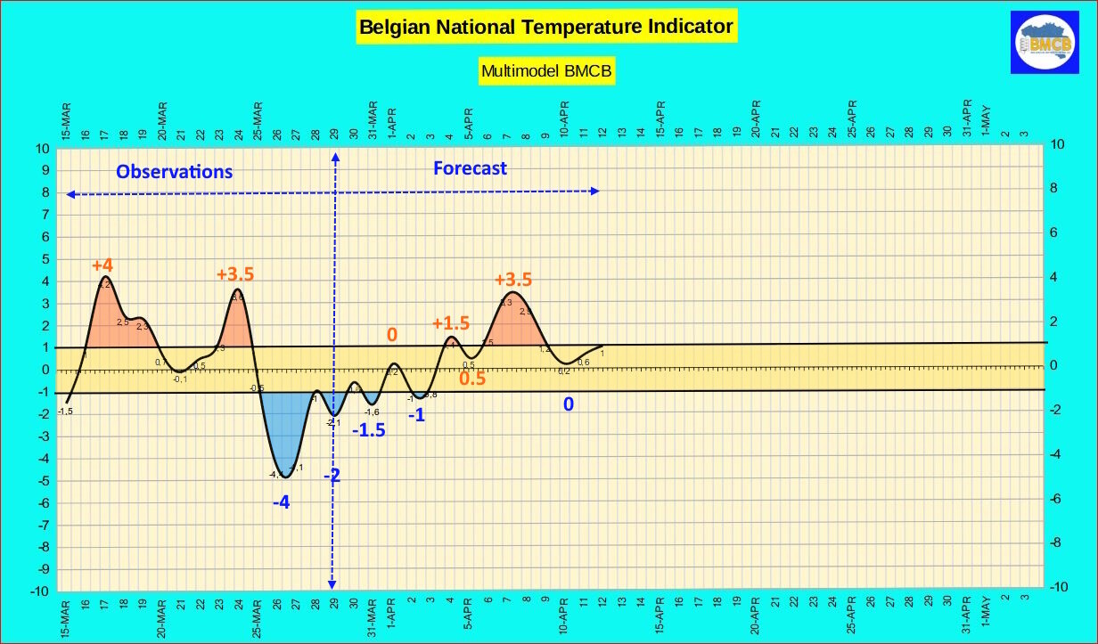 Tot 3 april blijft de Belgische nationale thermische index echter licht negatief, schommelend tussen -2 en 0.