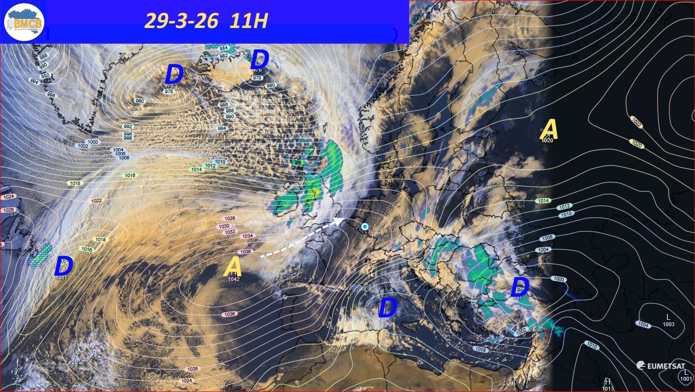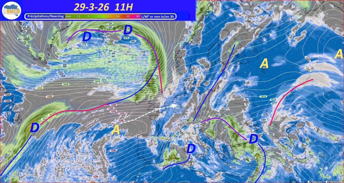 Deze depressie trekt vervolgens naar Scandinavië en veroorzaakt bij ons een zachtere zuidwestelijke stroming, voorafgaand aan een regenachtig koufront dat zondag wordt verwacht.
