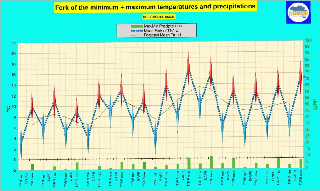 Volgens het BMCB-multimodel wordt de periode eind maart en begin april gekenmerkt door een opeenvolging van zwakke tot matige storingen in een aanvankelijk frisse en vaak bewolkte atmosfeer. Tussen 31 maart en 3 april trekken geregeld enkele regen- of buienzones over het land, soms vergezeld van een matige zuidwestenwind, terwijl de neerslaghoeveelheden doorgaans beperkt blijven.