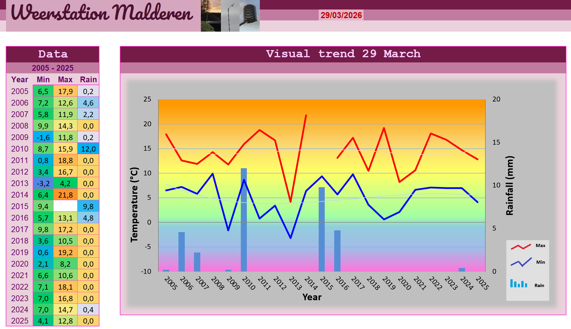 Zoals verwacht is het afgelopen nacht opnieuw tot vriestemperaturen gekomen, en waren het zowel de rijpkristallen als de sterren die bij het vroege ochtendgloren hun koude gloed door de ijle atmosfeer wierpen. In thermometerhut zijn de minima op 0,8 graden uitgekomen. De heldere lucht zorgde even later gelukkig voor uitbundige zonneschijn waardoor de vorst even snel was vergeten als de bloesems van appel- en perenbomen. De temperaturen gingen pijlsnel de hoogte in en we konden ons voorlopig voor de laatste keer koesteren in aangename lentezachtheid bij maxima van 18,8 graden. Vanuit Frankrijk naderden ondertussen restanten van een verzwakkend occlusiefront waardoor er vooral naar de avond toe meer sluierbewolking in het spel kwam. Dit zorgde ondermeer voor een langzamere afkoeling waardoor we komende nacht wellicht geen vorst meer zullen optekenen. In Frankrijk zorgde het verzwakte front voor een aantal lichte onweersbuien en in Malderen was er vandaag enkel een aantrekkende zuid- zuidwestenwind met snelheden tot 17,7 km/h voelbaar. In het laatste schemerlicht waren de eerste Altocumulus - en Stratocumulus reeds zichtbaar maar we hielden het tot na middernacht droog zodat het dagtotaal beperkt bleef tot 0,0 mm.