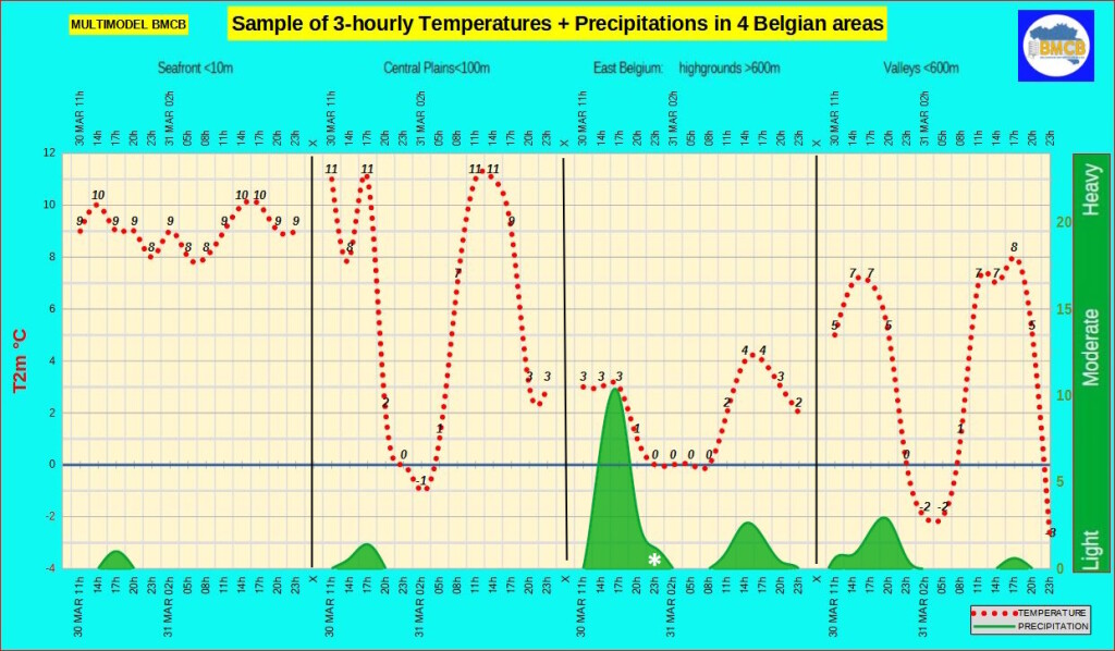 Temperaturen om 21u: 9°C aan zee, 3–9°C in de vlakte, 0–6°C ten zuiden van Samber en Maas
