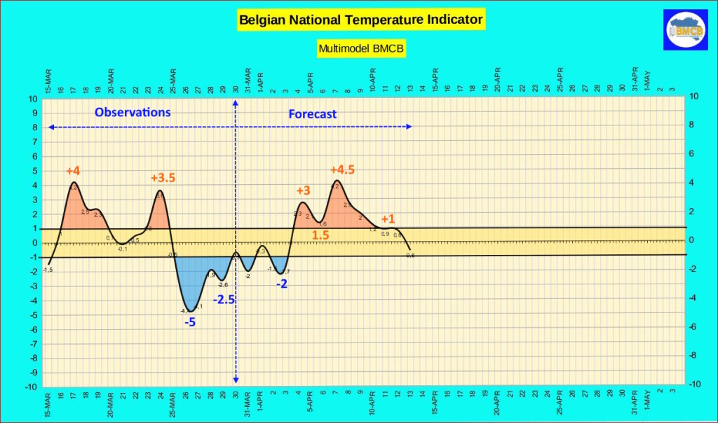 Tot 3 april blijft de Belgische nationale thermische indicator licht negatief, tussen -2 en 0. In deze context blijven de dagtemperaturen relatief koel voor het seizoen, meestal tussen 5 en 12°C afhankelijk van de regio.
