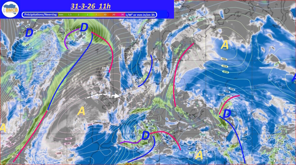 Een hogedrukcel van ongeveer 1024 hPa zal zich in de komende 24 uur geleidelijk over Centraal-Europa vestigen. Het centrum, woensdag boven Duitsland verwacht, zal tijdelijk zorgen voor stabilisatie van de luchtmassa met rustiger maar vaak nevelig weer.