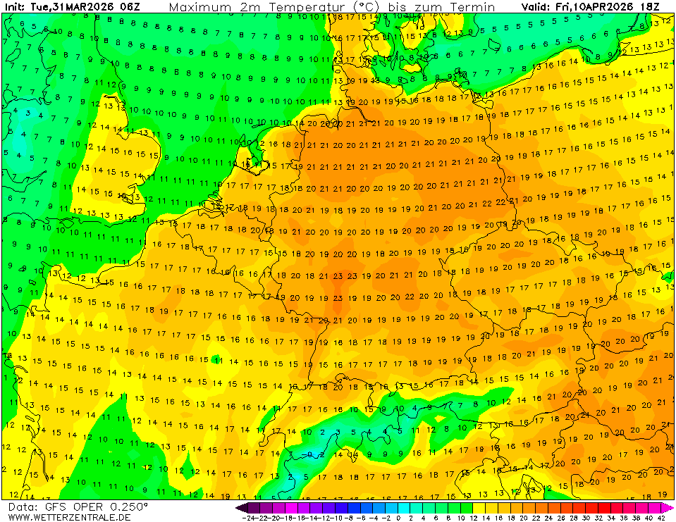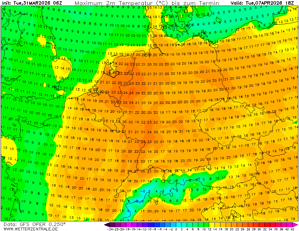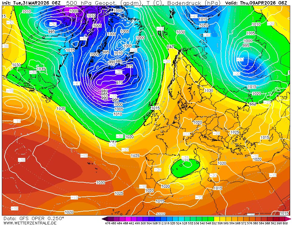 Vanaf eind deze week volgens deze operrun veelal hoge druk ten oosten van ons, waardoor met een meer zuidelijke stroming zeer zachte klucht deze kant op komt met temperaturen tussen 15 en 20 C en veelal droog weer. Dinsdag in het oosten en zuidoosten mogelijk 25 C en later kans op enkele (onweers)buien. Daarna weer onder de 20 C, maar nog enige tijd droog. Als dit toch mag uitkomen...