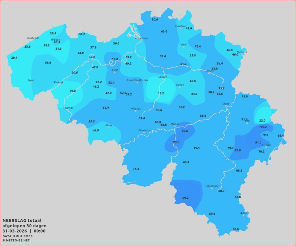 Regentotaal maart 21,2 mm - kaartje Belgie