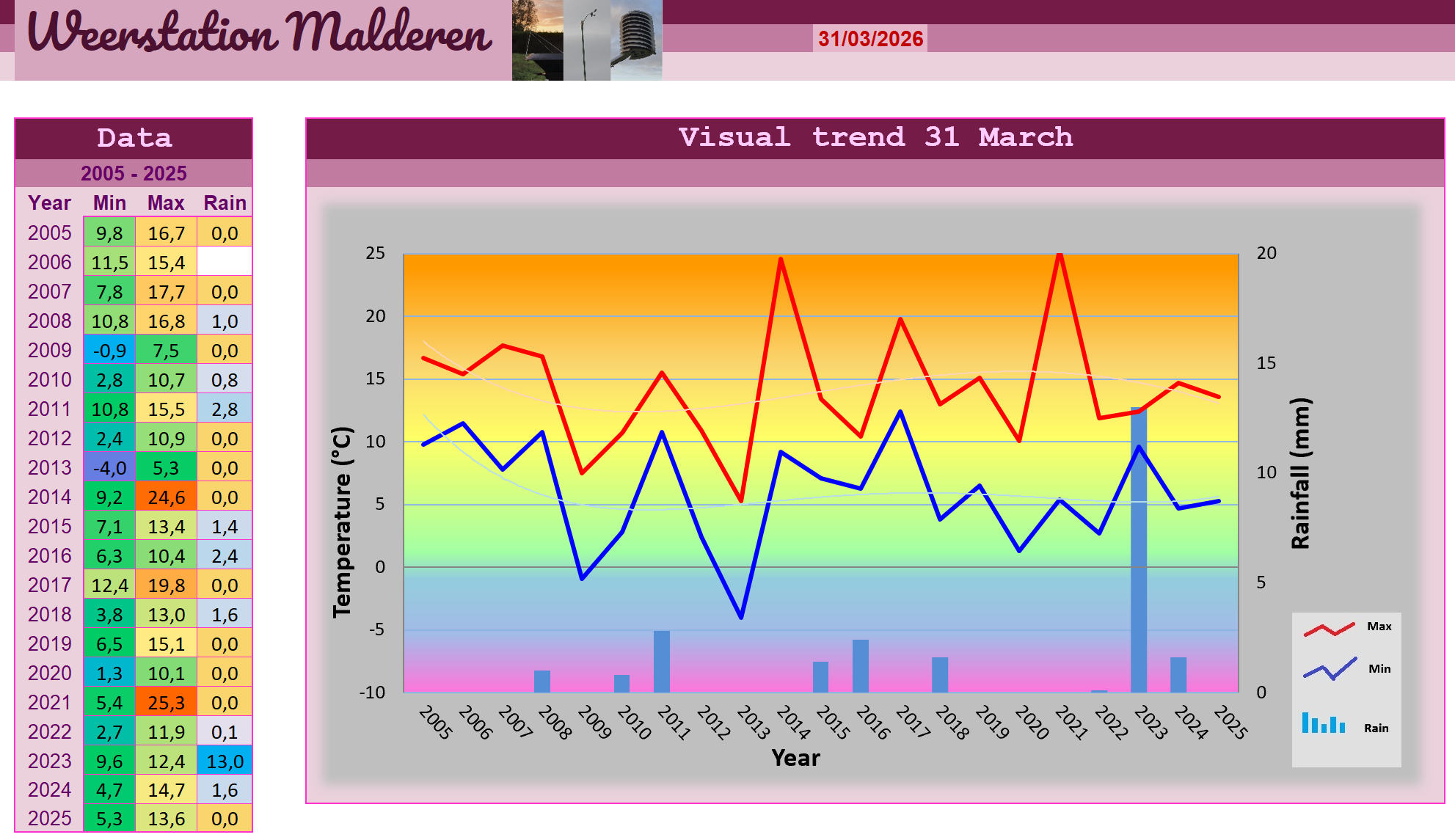 Opnieuw kregen we te maken met zeer heldere lucht en een buitengewoon felle voorjaarszon die de ochtendkilte van 5,4 graden erg snel wist te verdrijven. Dankzij de weggevallen wind en de nachtelijke afkoeling kon zich wat ochtenddauw vormen wat voor schitterende plaatjes zorgde in de vroege ochtend. Samen met de geuren en kleuren erbij maakte dit een ochtendwandeling door de natuur meer dan de moeite waard. En dan kwam de warmte die het kwik meteen de hoogte in stuwde terwijl er nergens een spoor van bewolking te zien was. De zuidwestenwind was bovendien zwakker dan gisteren waardoor die warmte ook relatief sterker aanvoelde en met maxima die op 25,3 graden piekten was het dan ook al snel zweten geblazen. Tijdens de namiddag verschenen echter de eerste voorboden van een spectaculaire ondergang die deze zomeropstoot volgens de weermodellen zou kennen. Het was een band van Cirrusbewolking die de staalblauwe hemel onderbrak en van zuidwest naar noordoost liep. En dan kwam de volgende voorbode: een beigekleurige waas in de atmosfeer die werd veroorzaakt door Saharastof dat door het oprukkende koufront naar het noorden werd getrokken. En dan kwam er nog een in de vorm van Altocumulus en Altostratus die in het noordwesten verscheen in de laatste schemering. Gelukkig kon het allemaal de zomersfeer niet bederven want we konden genieten van een erg zachte avond waarbij we tot een heel eind in de avond konden buiten zitten, al dan niet rond een 0,0 mm aanwijzende pluviometer.