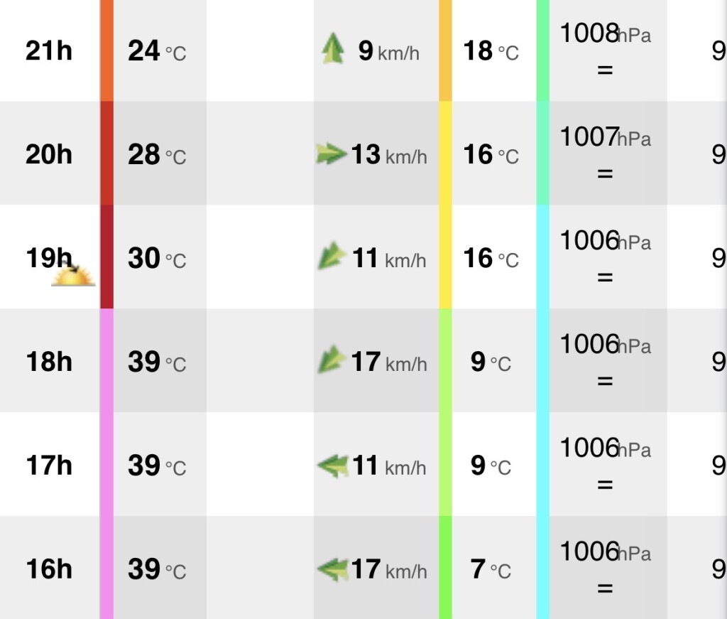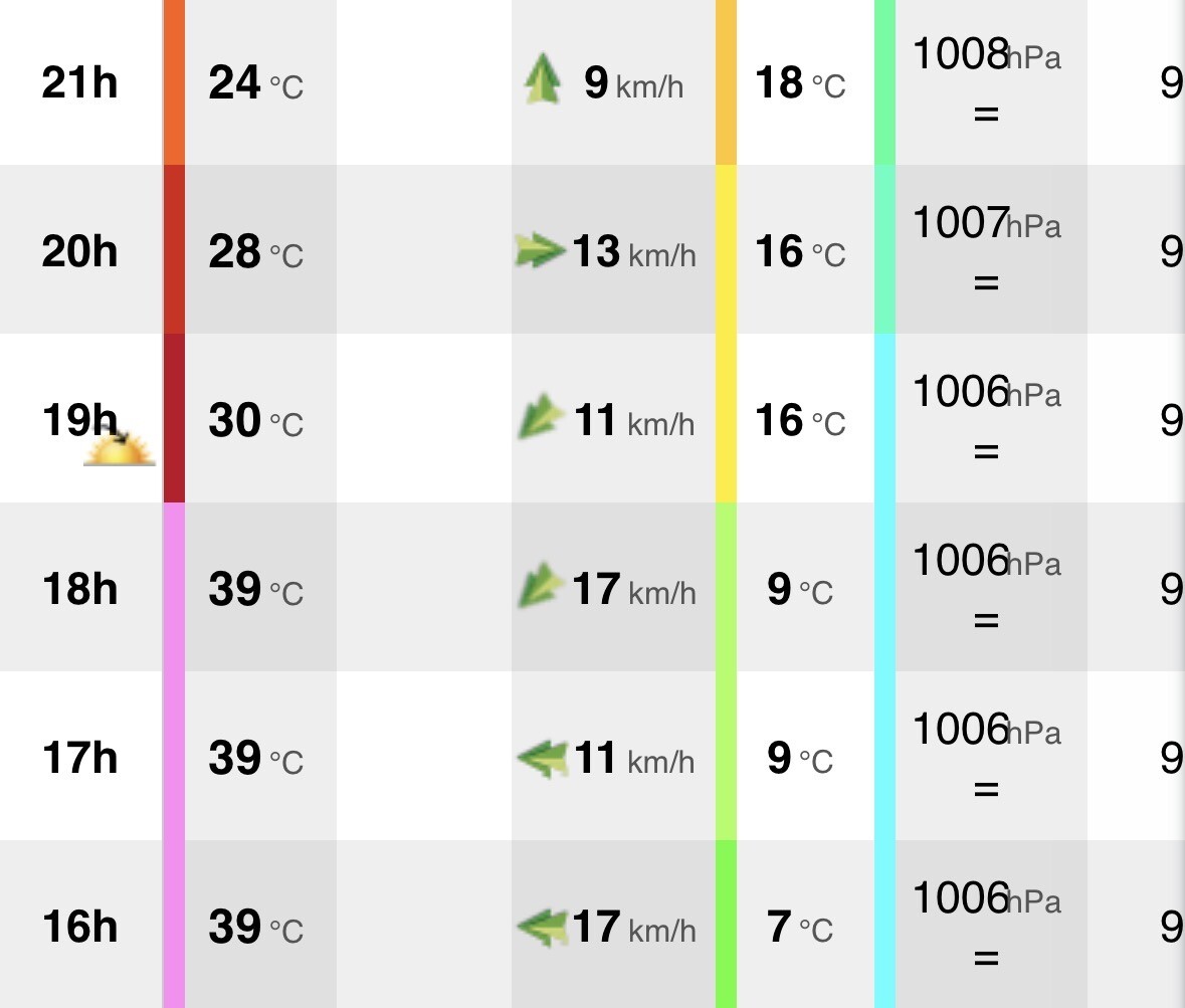 Hier ook tegen de 40°C aan overdag, bij zonsondergang wind vanop zee en meteen 10 graden koeler. Perfecte temperaturen als je het mij vraagt. Wat (tropische) convectie te zien in het binnenland