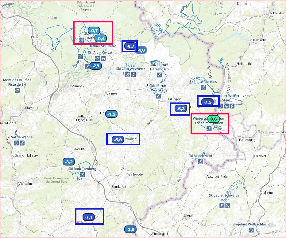 Terwijl de temperaturen op de hoger gelegen punten rond het vriespunt bleven of zelfs licht positief waren — met +0,6°C in Losheimergraben (675 m) — daalden ze in de valleien aanzienlijk lager.