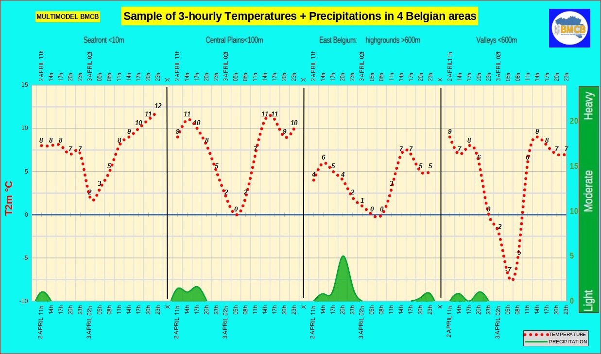 De neerslag in de komende 42 uur blijft zwak en ongelijk verdeeld, met doorgaans beperkte hoeveelheden: 0,5 tot 1,5 l/m² ten noorden van de Schelde, 1 tot 3 l/m² tussen de Schelde en de Samber-Maas-as en lokaal tot 9 l/m² in het zuiden van het land.