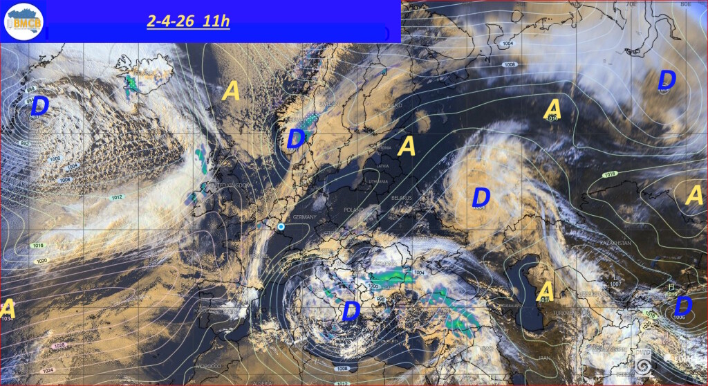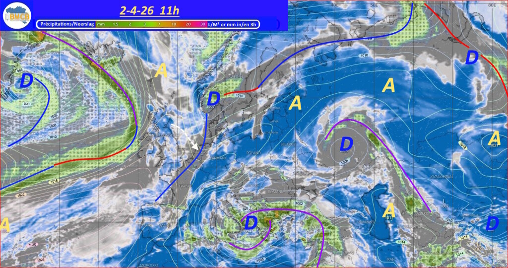 Deze configuratie bevordert aan het begin van het paasweekend de vorming van een hogedrukcel van ongeveer 1023 hPa boven Frankrijk en de Alpen, wat tijdelijk voor een verbetering van de weersomstandigheden zorgt.