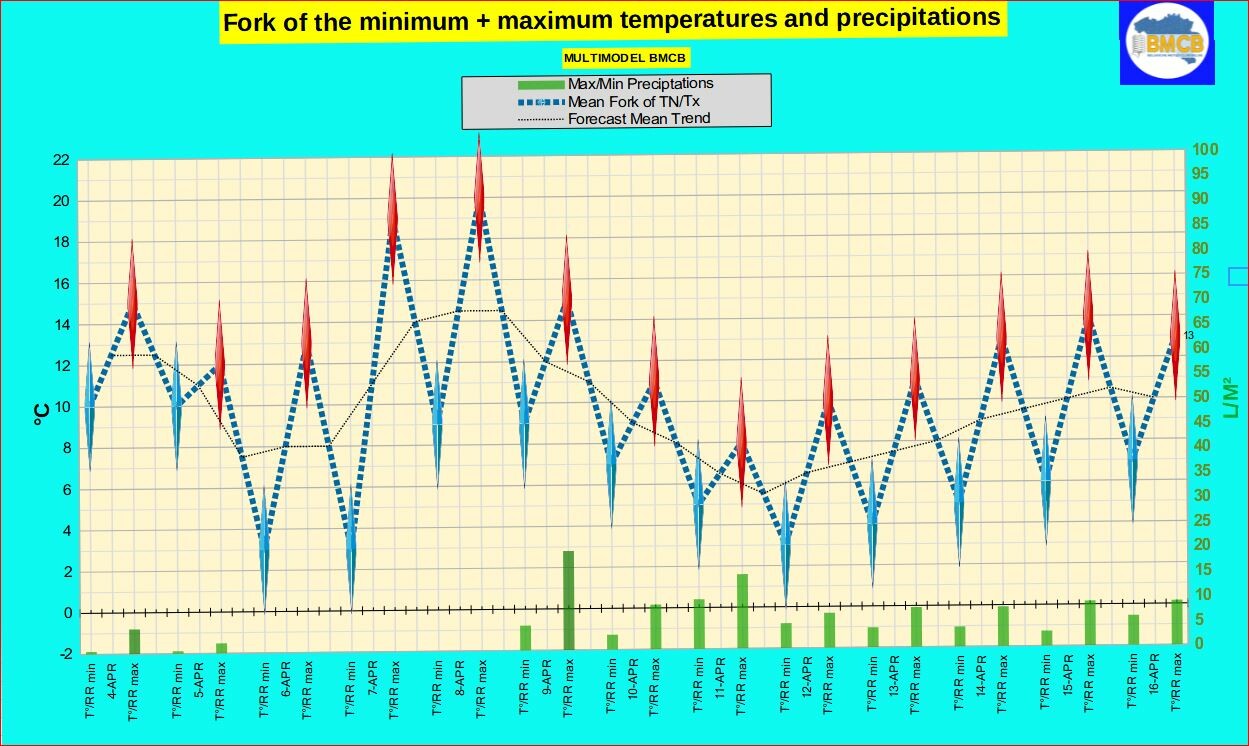 Van 10 tot 16 april wijst de algemene tendens op frisser en vaak onstabiel weer. Meerdere storingen trekken over het land met regelmatige regen of buien, soms matig intensief, met dagelijkse neerslaghoeveelheden meestal tussen 4 en 10 L/m², lokaal meer tijdens het weekend van 11 en 12 april.