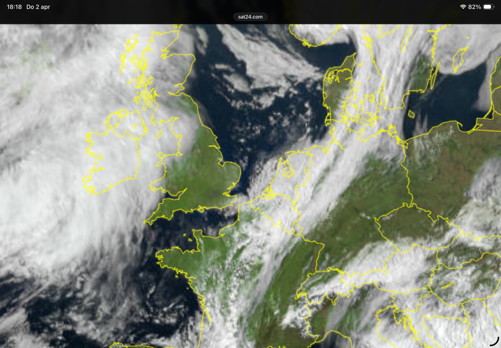Het kan in het voorjaar aan de kust zo helder zijn en boven zee met bewolking land inwaarts maar ik zie het vaker gebeuren de laatste tijd dat achter een passerend front de bewolking voor onze kust steeds aangroeit. Het leek vanmiddag op te gaan klaren maar de zaak zit gewoon potdicht 50 tinten grijs.