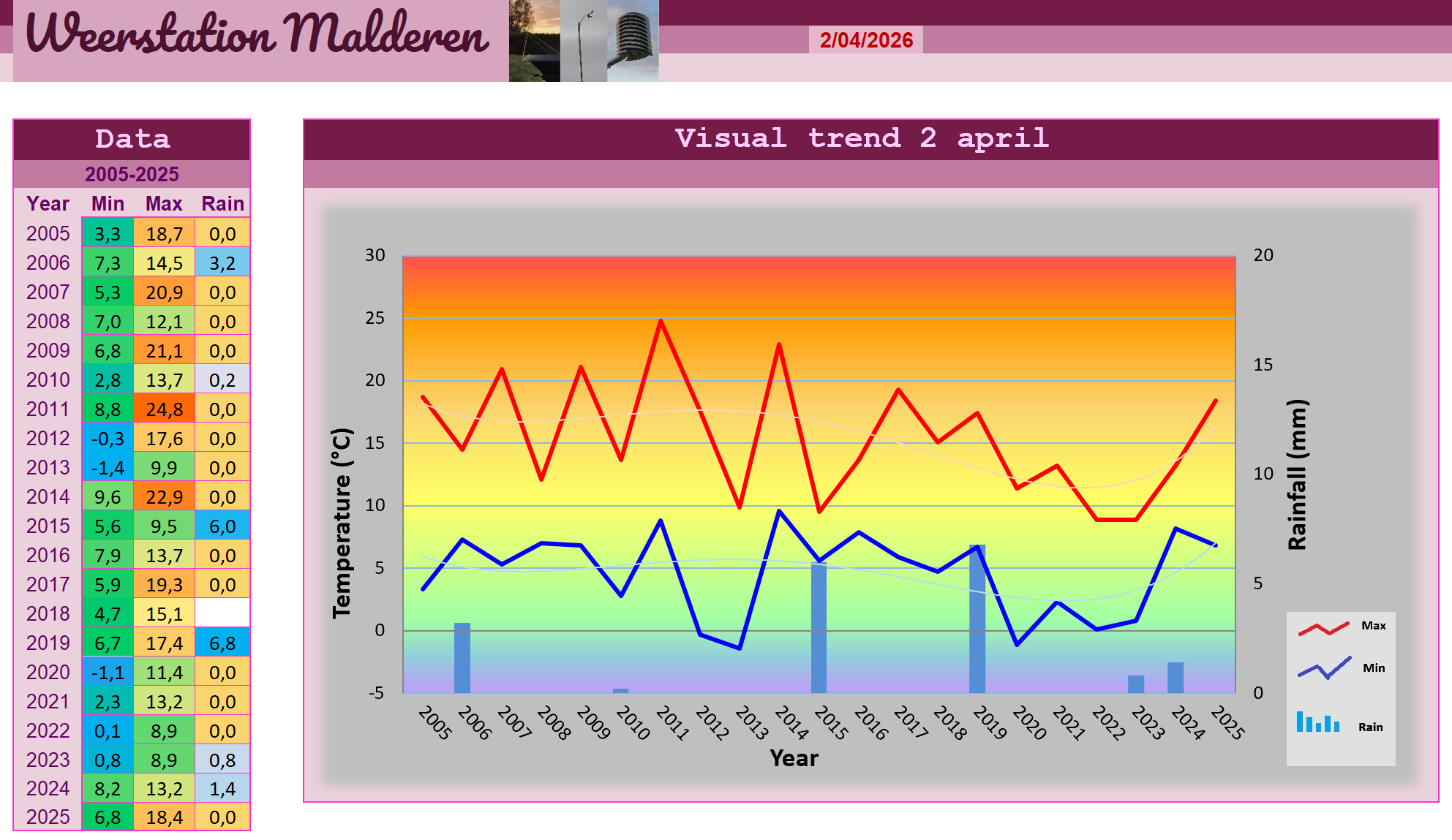 27 jaar Hendrik Mertens en 2 jaar Weerstation Malderen. Om dit gebeuren te vieren besloten de weergoden hierboven om de regendans uit te voeren. Dit resulteerde natuurlijk in een loodgrijze ochtendhemel waaruit niet onaardige hoeveelheden regenwater afdaalden richting Malders grondgebied. Het ging echter erg snel want het grootste deel van de nacht waren er nog opklaringen terwijl de regenzone ons nog voor de middag had verlaten. De wolken bleven ons echter gezelschap houden naast de opklaringen die vanuit het westen kwamen opzetten, en naarmate de zon ons verder opwarmde, vonden sommige wolken de nodige energie om zich tot buitjes te organiseren, al waren de hieraan ontsproten neerslaghoeveelheden verwaarloosbaar en kunnen we de 3,2 mm die er vandaag viel volledig op naam van de regenzone zetten die ons vanmorgen plaagde. Minder verwaarloosbaar was dan weer de wind die vandaag duidelijk geen grenzen kende en met haar snelheden tot 45,1 km/h uit zuidwest tot zuidelijke richtingen ervoor zorgde dat het erg guur aanvoelde, zeker wanneer de zon verstoppertje speelde achter de voorbijsnellende stapelwolken. De lucht was nog steeds van polaire oorsprong dus van het kwik hoefden we geen uitzonderlijke prestaties te verwachten. 7,3 tot 14,5 graden waren de waarden waarmee we ons tevreden moesten stellen terwijl brede opklaringen tegen zonsondergang de afkoeling deden versnellen.