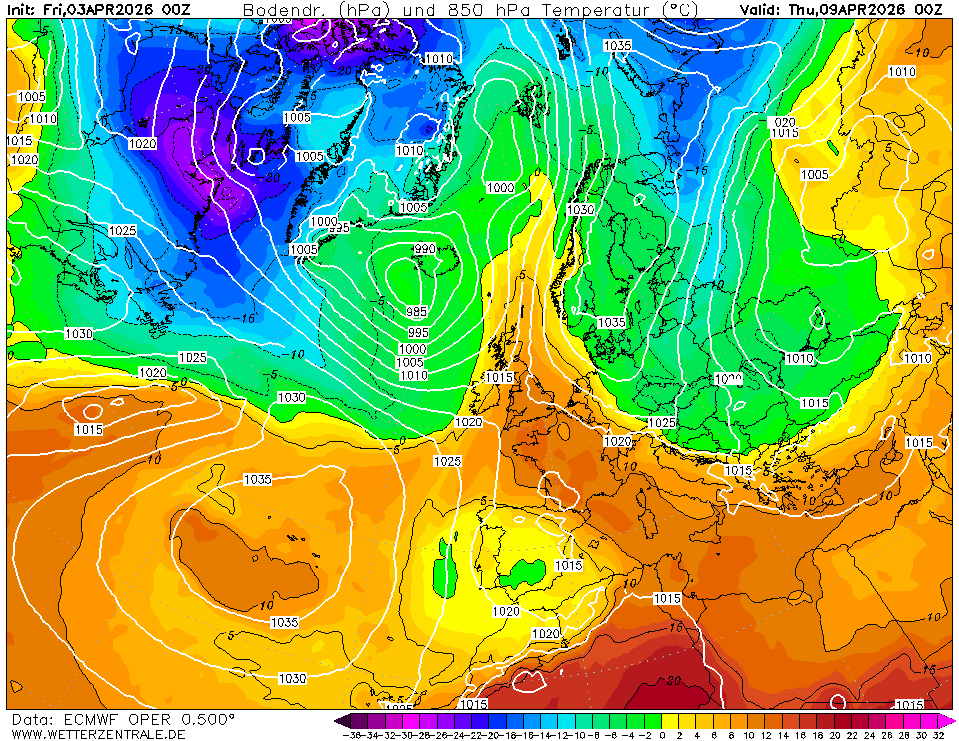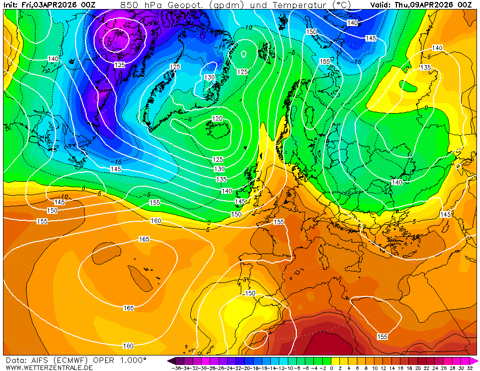 We krijgen de donderdag 'erbij'. In eerdere berekeningen zagen we bij EC dat we 1 dag warmte zouden krijgen, ja, zelfs zomers van aard. Nu, minder warm, wel meer dagen boven normaal. Waarbij dus ook de donderdag.