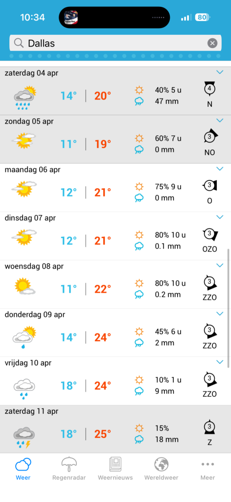 Flink bakje regen opkomt en de warmte valt nog reuze mee aldaar. Uiteindelijk warmt de verwachting wel op naar de waarden die ke verwacht tussen 24 tot 28 graaieeen. Ik had het veel hoger verwacht iig. Ik hoop ooit nog eens doorheen Texas te kunnen trekken; toch een staat ter grote van Frankrijk en dan door naar Californië en uiteindelijk in Seattle eindigen.