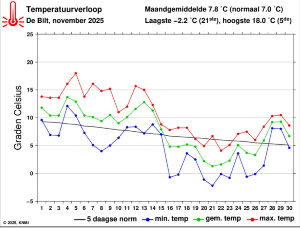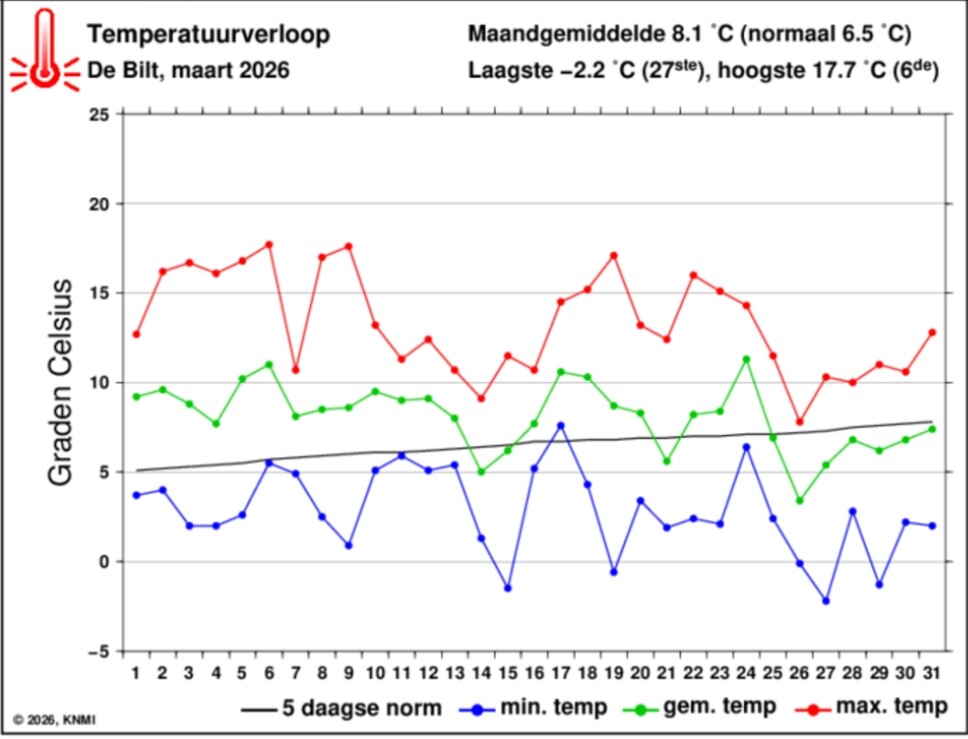 Dat afgelopen maart qua thermisch verloop best wat gelijkenis vertoont met afgelopen november. Alleen zat er in maart nog een zachte periode tussen de twee koele perioden door.
