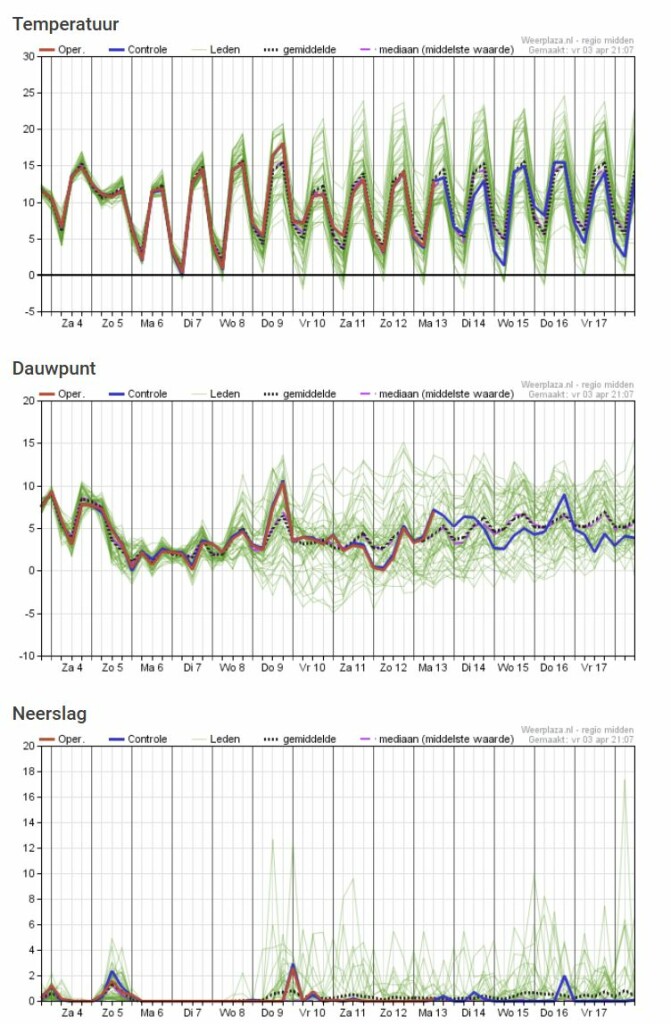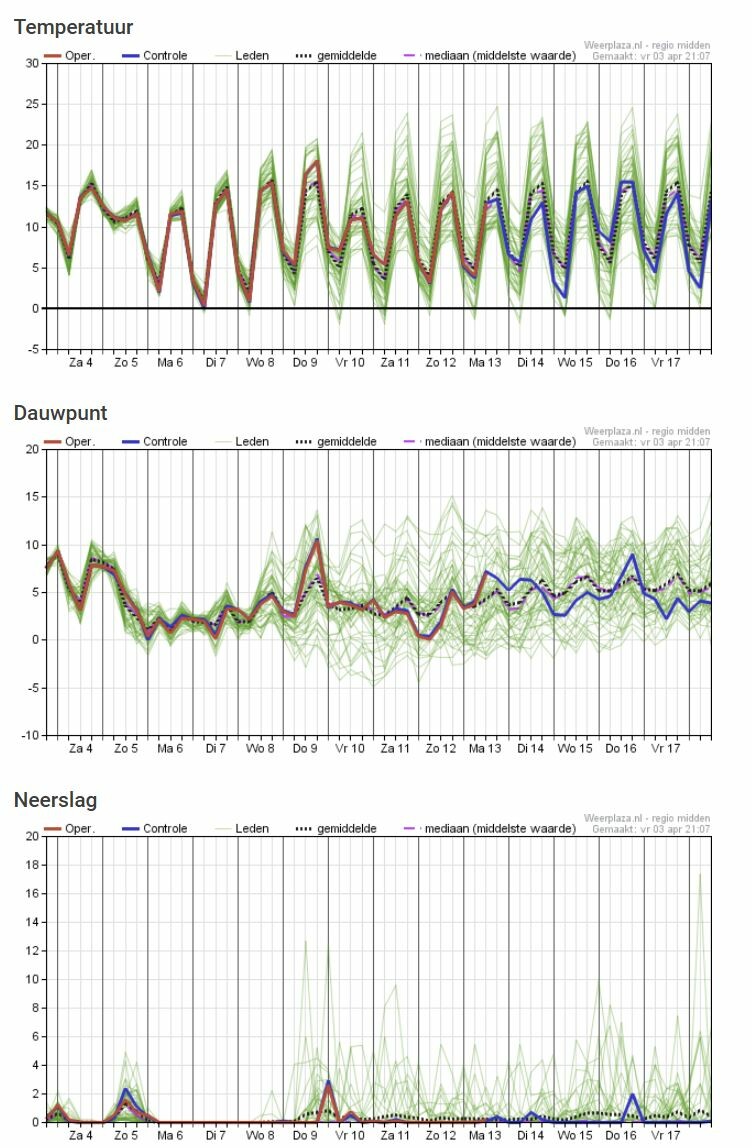 Komende twee weken weinig neerslag. Temp ligt vaak in de buurt van de 15c. Daarmee niet slecht, maar ook niet het echte lenteweer met 20c, waar sommige zo intens naar verlangen. Na het weekend weinig wind.