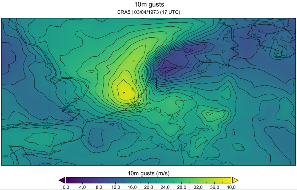 Er is een uurgemiddelde van 112 km/u en windstoten van 155 km/u gemeten. Deze storm behoort tot een van de zwaarste stormen die Nederland heeft gekend. ERA5 laat ook wel een fors windveld zien, wat bijzonder is voor een model met een relatief lage resolutie.