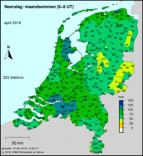 De laagste neerslagsom van alle maanden. Rond 40mm. De helft minder dan wat de zomer en wintermaand normaal opleveren.