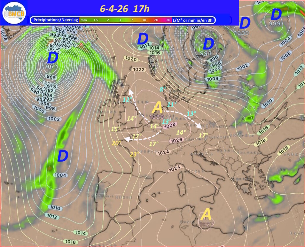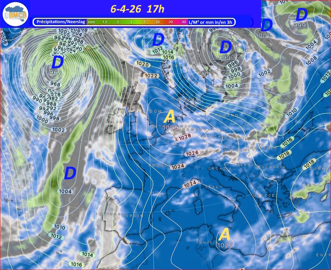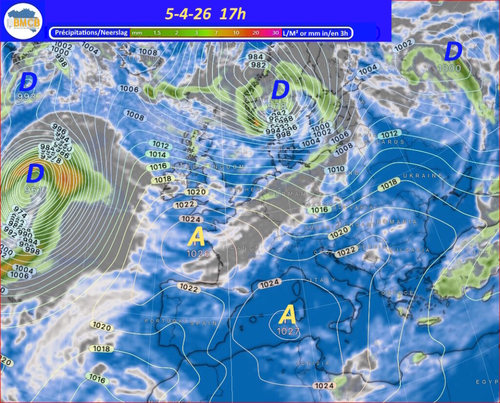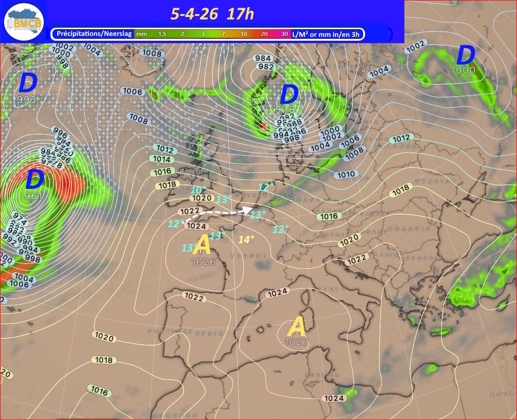 Een zwak koufront trekt op Paaszondag van west naar oost over het land, gevolgd door een snelle versterking van een hogedrukcel boven Bretagne. Deze verplaatst zich maandag naar het noorden van Nederland en bereikt ongeveer 1029 hPa, waardoor geleidelijk stabiel en droog weer ontstaat, al blijven er nog vrij veel cumuluswolken.