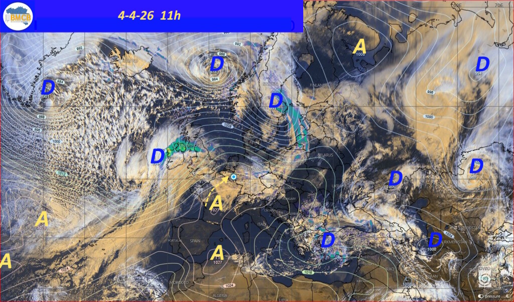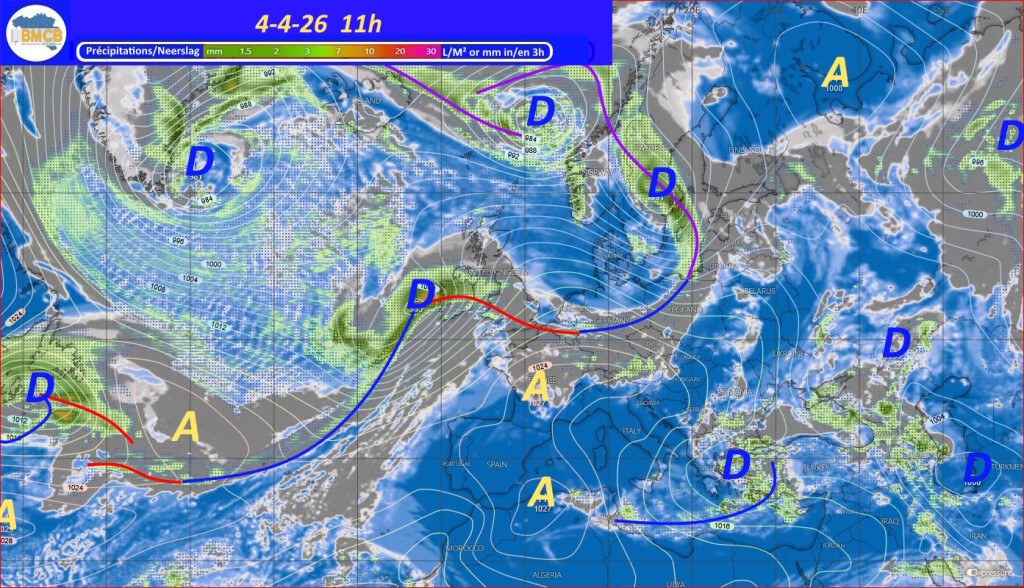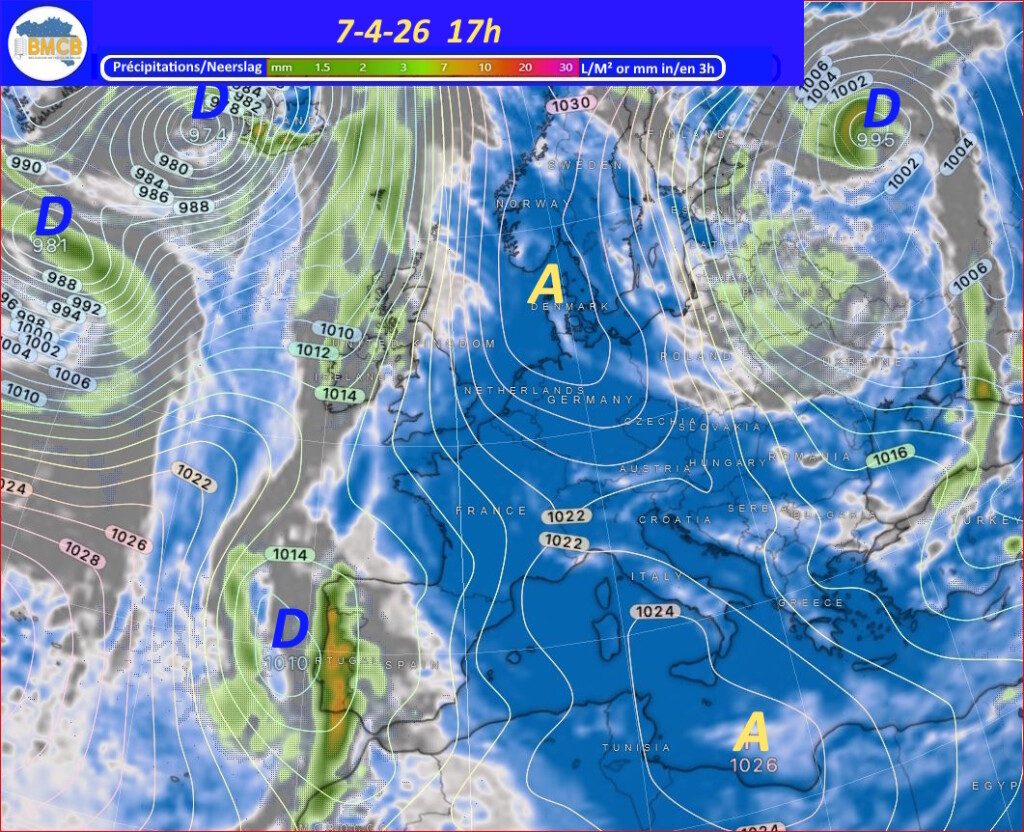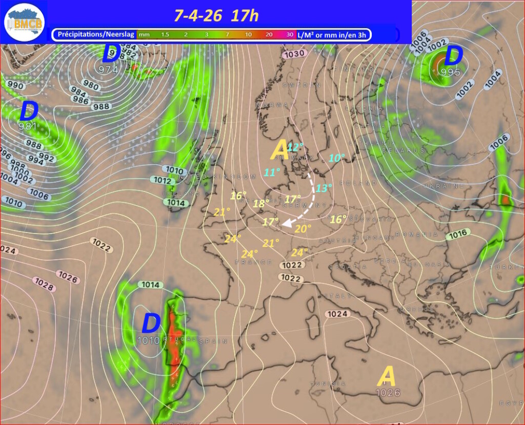 Een zwak koufront trekt op Paaszondag van west naar oost over het land, gevolgd door een snelle versterking van een hogedrukcel boven Bretagne. Deze verplaatst zich maandag naar het noorden van Nederland en bereikt ongeveer 1029 hPa, waardoor geleidelijk stabiel en droog weer ontstaat, al blijven er nog vrij veel cumuluswolken.