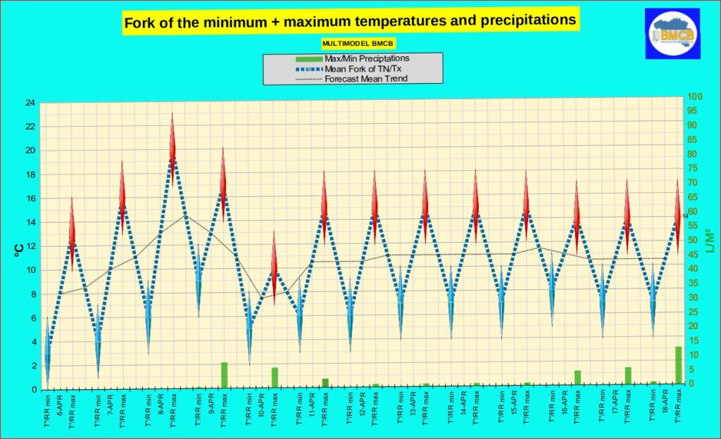 Begin van de volgende week blijft het meestal droog met een geleidelijke verzachting. Tegen het einde van de periode, rond 16 tot 18 april, zouden de kansen op regen of buien opnieuw toenemen.