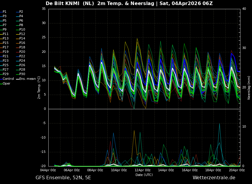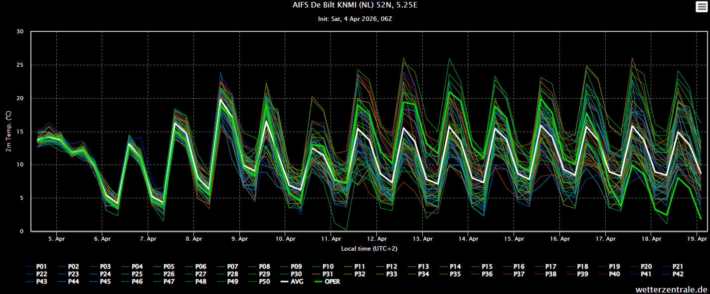 Er blijven uitschieters richting de twintig graden in de pluim, een enkele keer zelfs 25+ graden, die waarschijnlijkheid wordt natuurlijk steeds groter met het vorderen van het seizoen. Het AIFS en het GFS zijn verder behoorlijk eensgezind hun temperatuurverwachting. Vorstkansen zijn nihil.