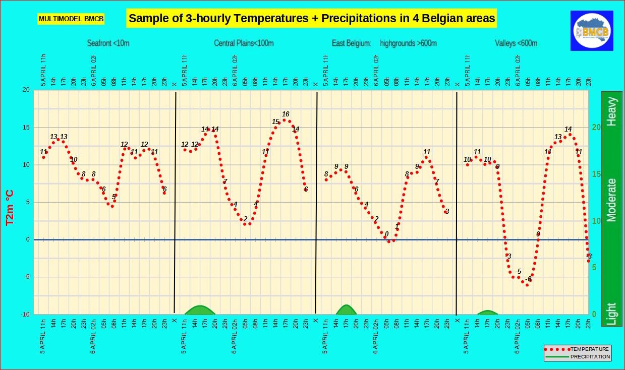 ’s Avonds verschijnen brede opklaringen. De nacht verloopt helder tot licht bewolkt met zwakke wind. Minima: rond 5°C aan zee, 1 tot 5°C landinwaarts, 0 tot 2°C ten zuiden van Samber en Maas en -1 tot -6°C in valleien.