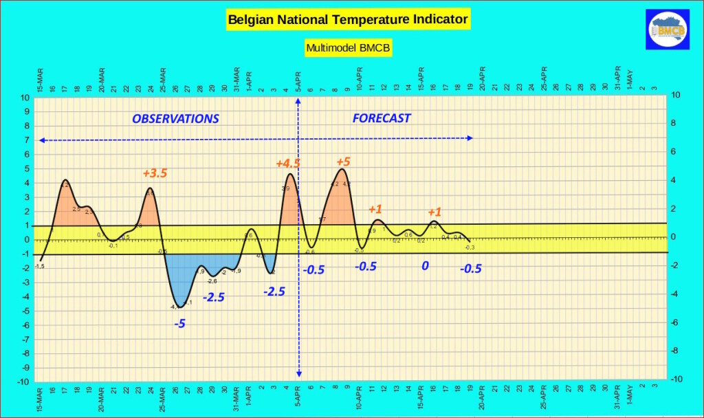 Daarna volgt een geleidelijke verzachting, met een thermische index die rond 8 en 9 april stijgt naar ongeveer +5. De maxima bereiken dan 16 tot 22°C, wat zorgt voor een duidelijk lentegevoel.