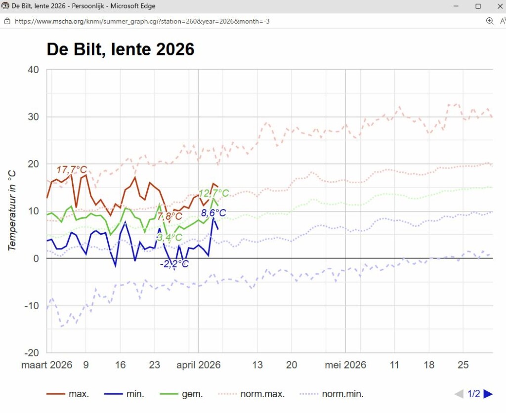 Mogelijk donderdag iets hoger. Daarna voorlopig niet. Valt dit jaar de hoogste temp van de lente in maart? Zou geweldig zijn (weerbril op) maar, erg onwaarschijnlijk.