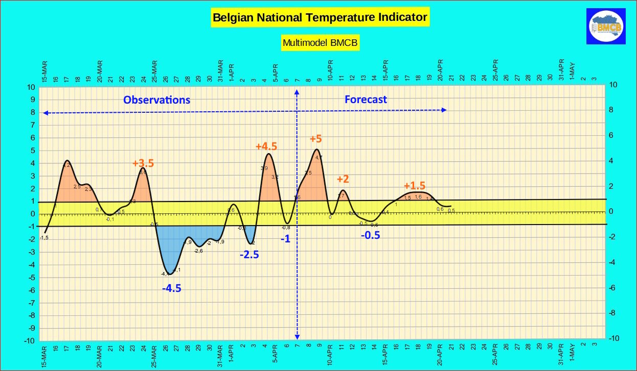 De nationale thermische indicator blijft de komende dagen stijgen en bereikt een piek tussen 8 en 9 april met een waarde rond +5. Dit vertaalt zich in bijzonder zachte dagtemperaturen van 17 tot 23°C over het hele Belgische grondgebied.