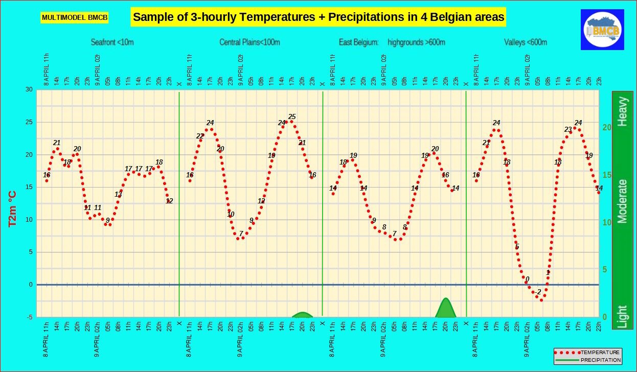 De avond en nacht verlopen helder tot licht bewolkt. De wind neemt verder af en de minima dalen tot ongeveer 9°C aan de kust, 5 tot 11°C in het binnenland en lokaal dicht bij het vriespunt in enkele valleien.