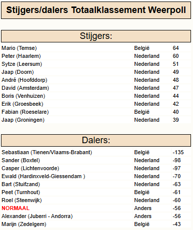 De nummer drie is nieuw in de persoon van Rens (Stellendam), terwijl de 4e plaats in handen blijft van een andere tweevoudig jaarwinnaar in de persoon van Koos (Froombosch).