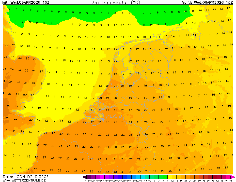 De modellen onderschatten dit toch behoorlijk. Pluim zuid komt aan 20°C en de detailmodellen zoals ICON 21-22°C. Werkelijkheid 23-24°C. Morgen zou dus inderdaad zomers kunnen worden.