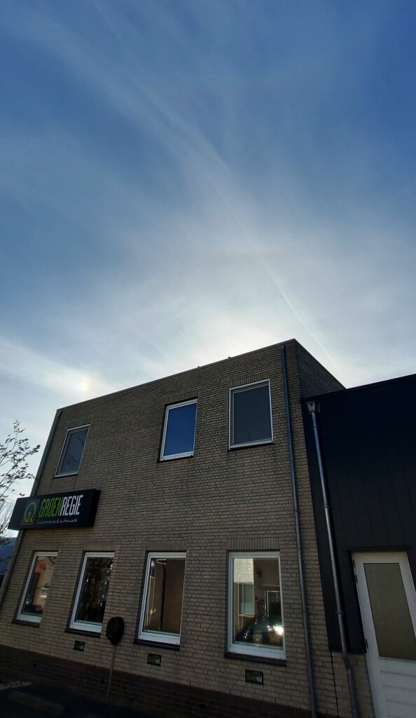 Circumzenitale boog, bovenraakboog, kleine kring en linkerbijzon rond 18.00 uur. Foto is gemaakt met mobiele telefoon.