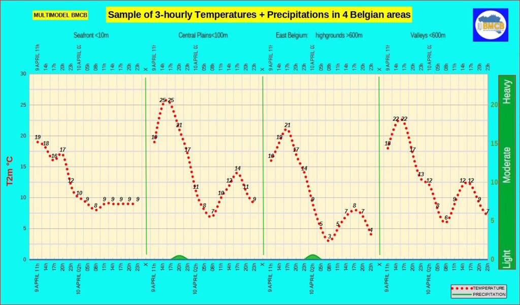 Tegen het einde van de namiddag en in de avond neemt de bewolking toe vanuit het westen met kans op enkele lichte buien, lokaal zelfs een geïsoleerde onweersbui, vooral in de Kempen. Tijdens de nacht wordt het zwaarbewolkt tot betrokken met plaatselijk lichte regen, vooral in de Ardennen. De wind draait naar noordwest en neemt toe. Minima tussen 3 en 9°C ten zuiden van Samber en Maas, 7 tot 9°C in het binnenland en ongeveer 8°C aan zee.