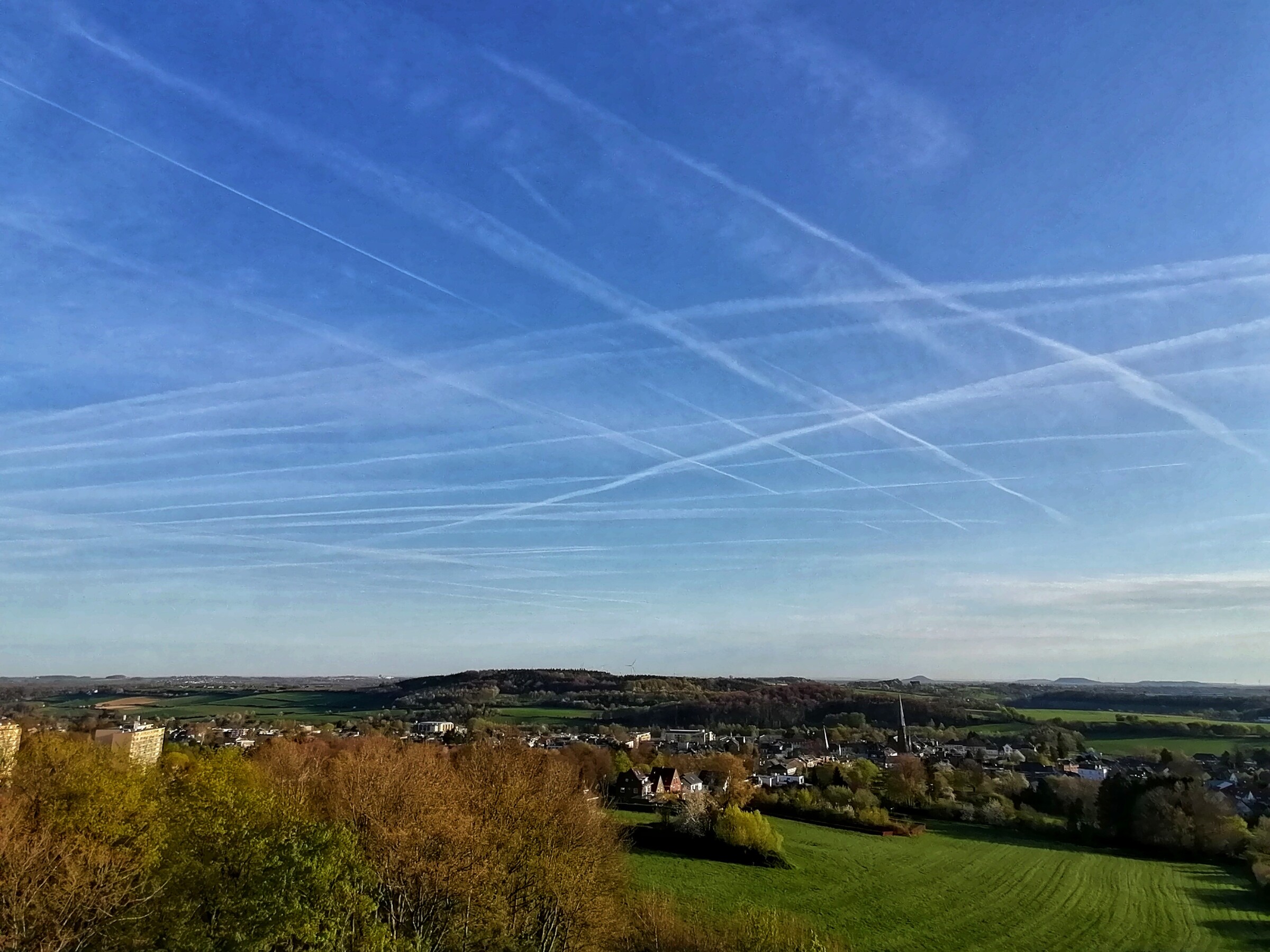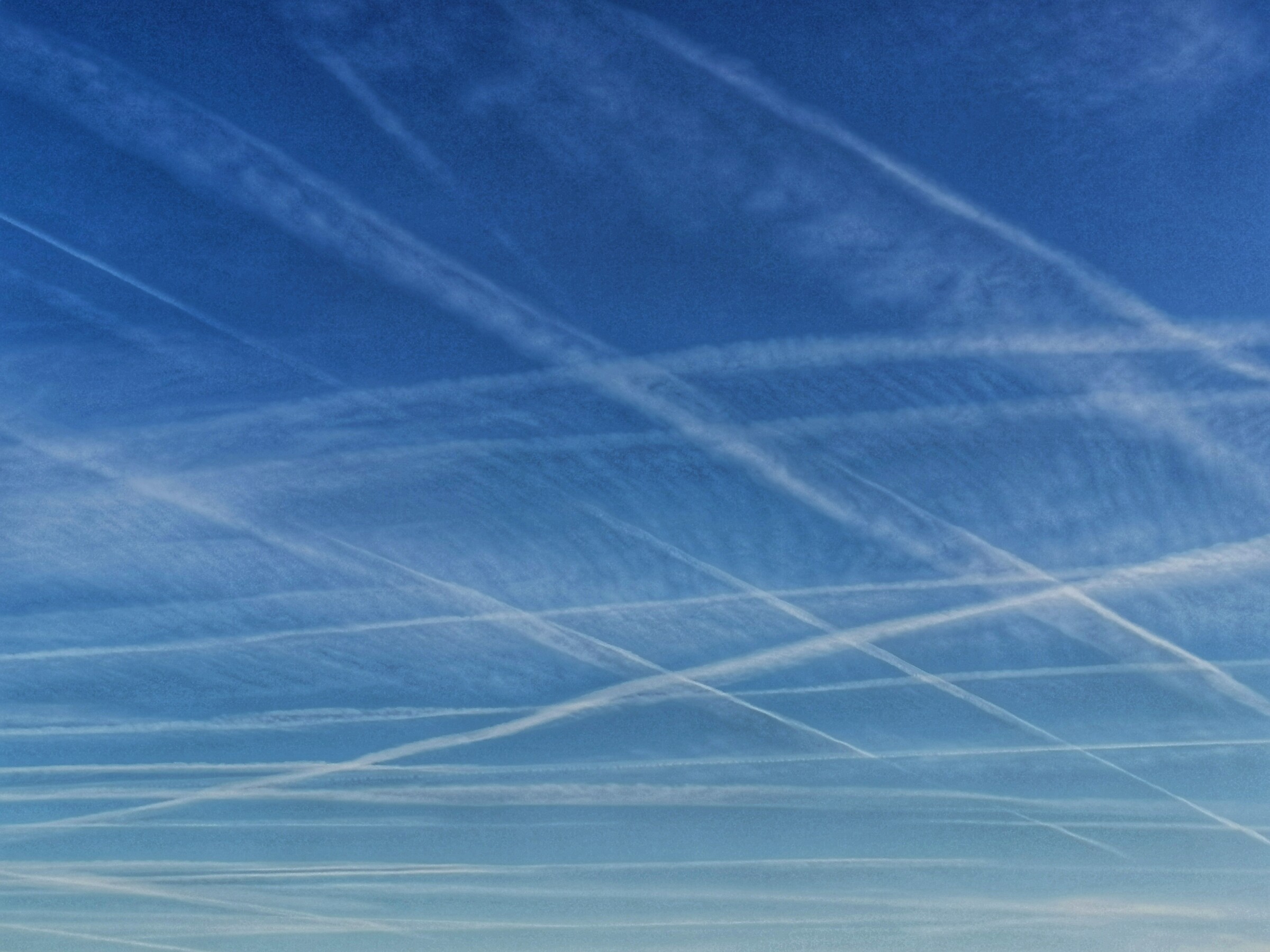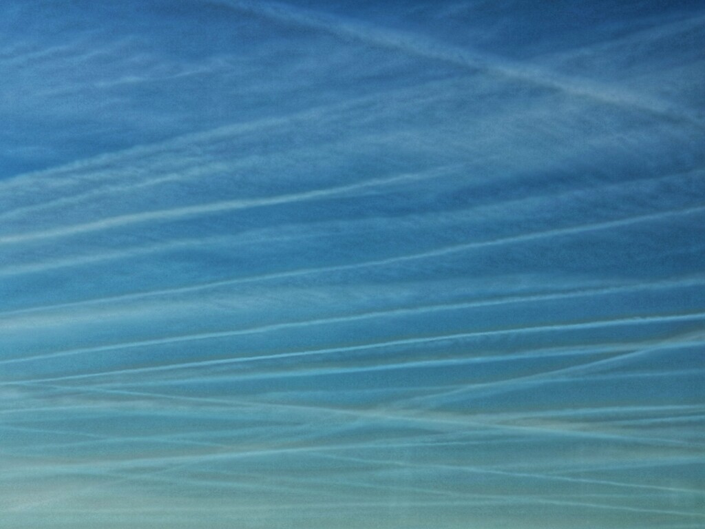 Hedenochtend keek ik omhoog en zag ik een prachtige weelde van vliegtuigstrepen. De atmosfeer is verzadigd. De krankzinnige welvaart in beeld gebracht ...