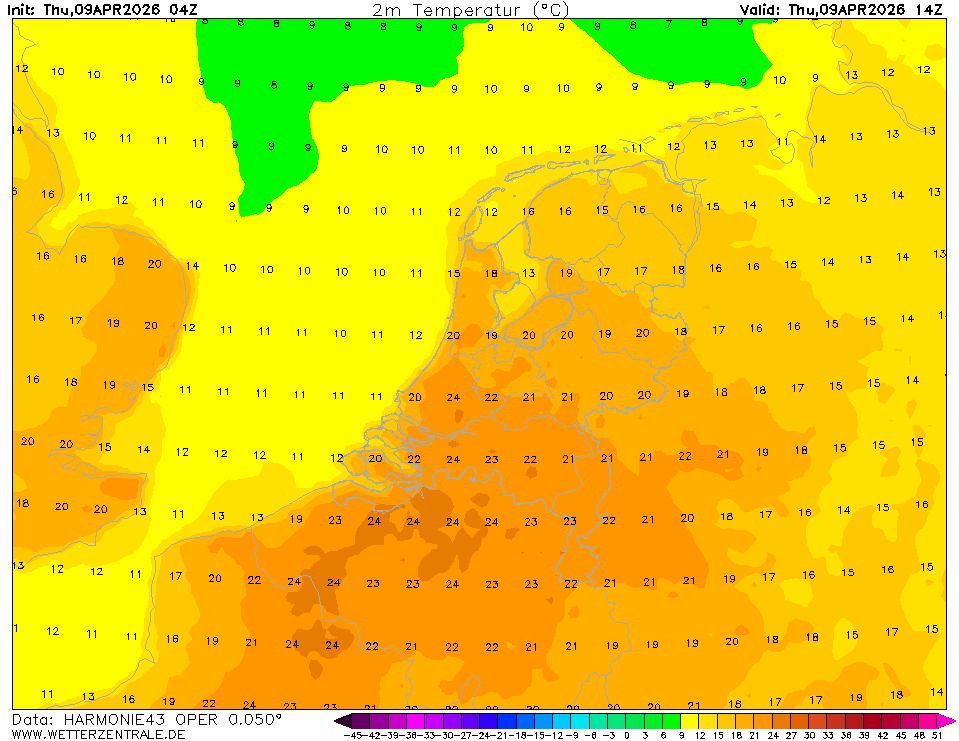 Grootschalig 20-plussers, lokaal tot 24-25 graden. Niet alleen in België maar ook in ZW Nederland is die mogelijkheid aanwezig.
