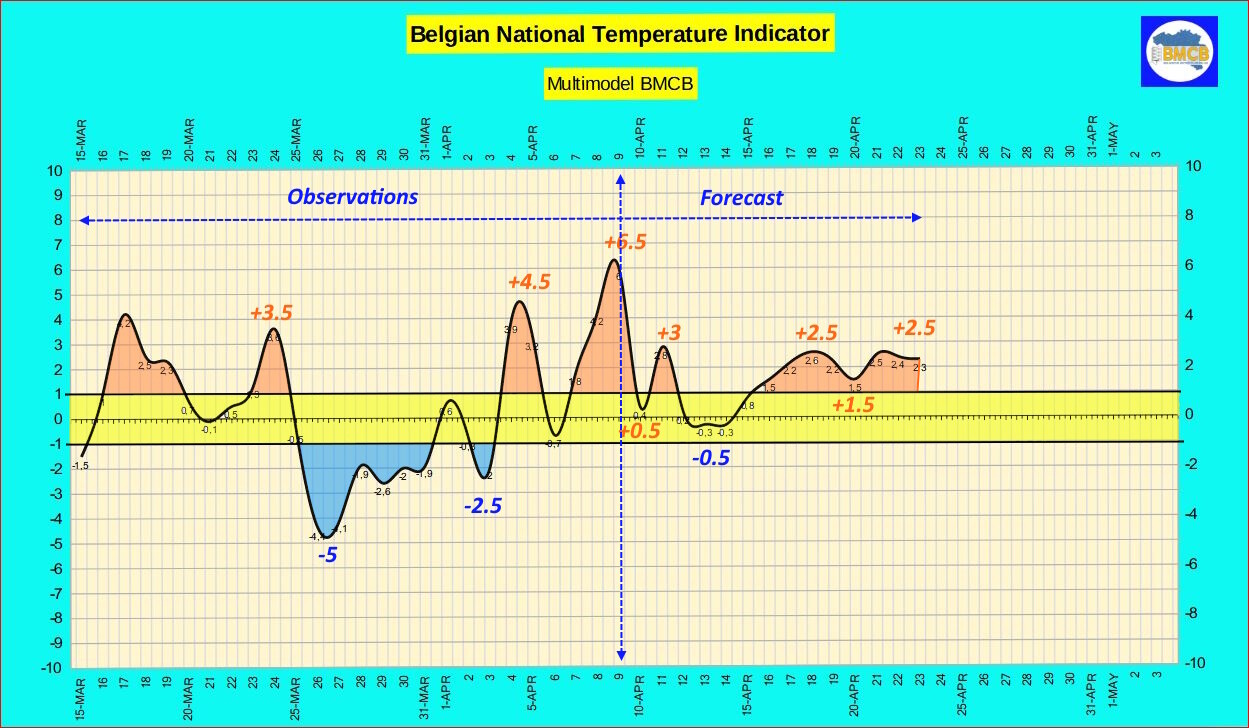 Er zijn weinig veranderingen ten opzichte van de verwachtingen van gisteren. De zachte piek van 9 april vormt het meest opvallende moment van de periode, met een nationale thermische index van +6 tot +7 en maximumtemperaturen tussen 19 en 25°C over heel België.