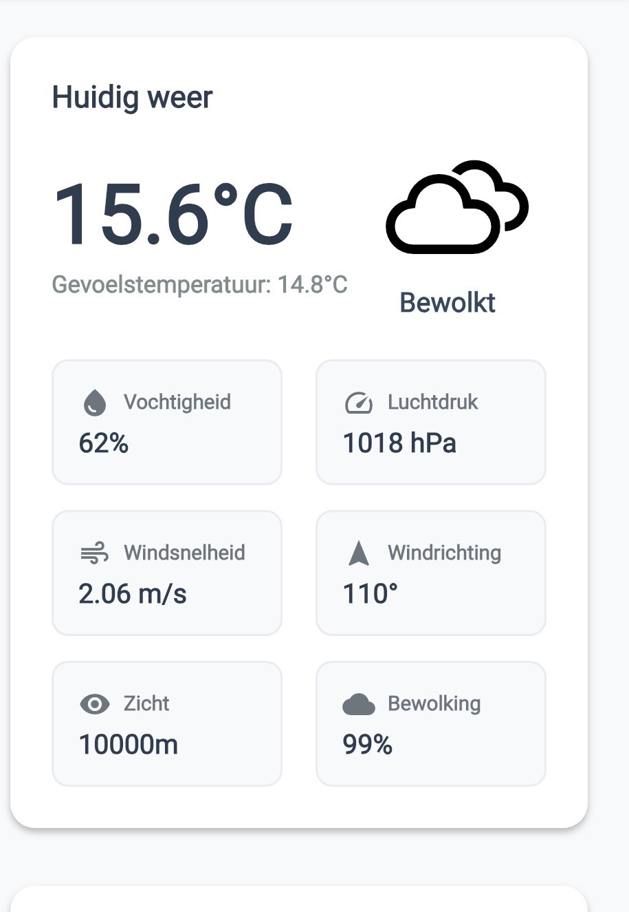 Hier is het 15,6C en zonnig. En er waait nauwelijks wind. (Negeer dat bewolkte icoontje, want dat doet mijn app ook als er alleen sluierbewolking is. En dat is er momenteel. Maar dat stelt nauwelijks iets voor)