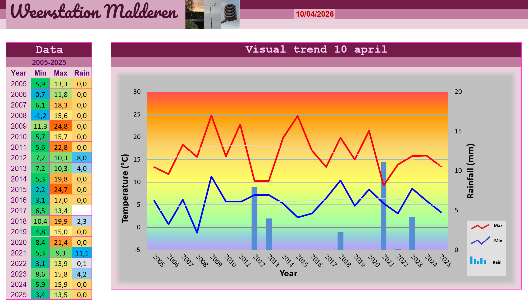 Een slepend koufront zorgde na een drogere periode afgelopen nacht voor flink wat neerslag overdag. De hele dag door was het grijs en regenachtig waarbij opviel dat de wind geleidelijk zwakker werd naarmate de uren verstreken. De maximumsnelheid werd dan ook al vroeg in de morgen bereikt met 46,7 km/h uit het zuidwesten. Er vormde zich een golfje op het front waardoor het zootje zich eventjes terugtrok naar het westen met wat droger en lichter weer tot gevolg. Maar daarna was het opnieuw prijs en begon het flink te gieten uit een dik Nimbostratus wolkendek met de karakteristieke pannus wolken eronder. Tijdens dat drogere intermezzo warmde het op tot 10,3 graden en de minima werden later bereikt door de geleidelijke opmars van koelere lucht. Maar deze waren niettemin zacht door de bewolking met 7,2 graden. Tijdens de avond kwamen we dan toch nog aan de achterzijde van het front terecht en konden we meegenieten van de opklaringen die in het noordwesten van Nederland al een groot deel van de dag zonnig lenteweer hebben gebracht. De zon zelf kregen we alleen maar in matglasversie te zien, maar toen ze onder was zorgde weerkaatsing van haar laatste stralen voor een vuurrood kleurenspektakel als afsluiter voor deze kille regendag. Tijdens de uren daarop bleef het rustig en zwaarbewolkt met enkele spatjes regen, maar deze was niet meer meetbaar zodat het dagtotaal met 8,0 mm al lang een feit was.