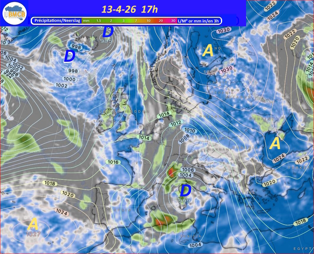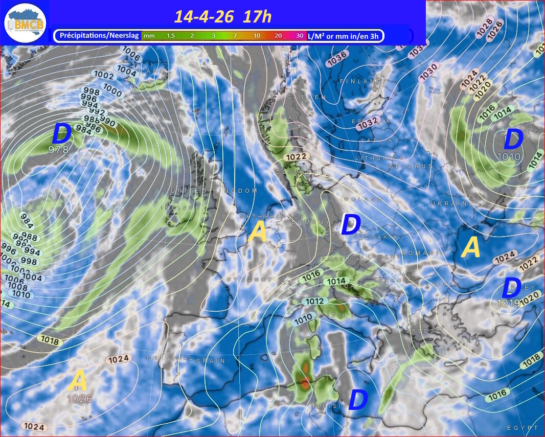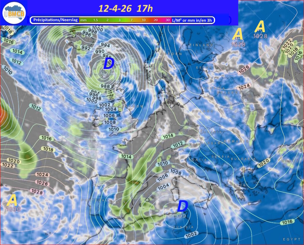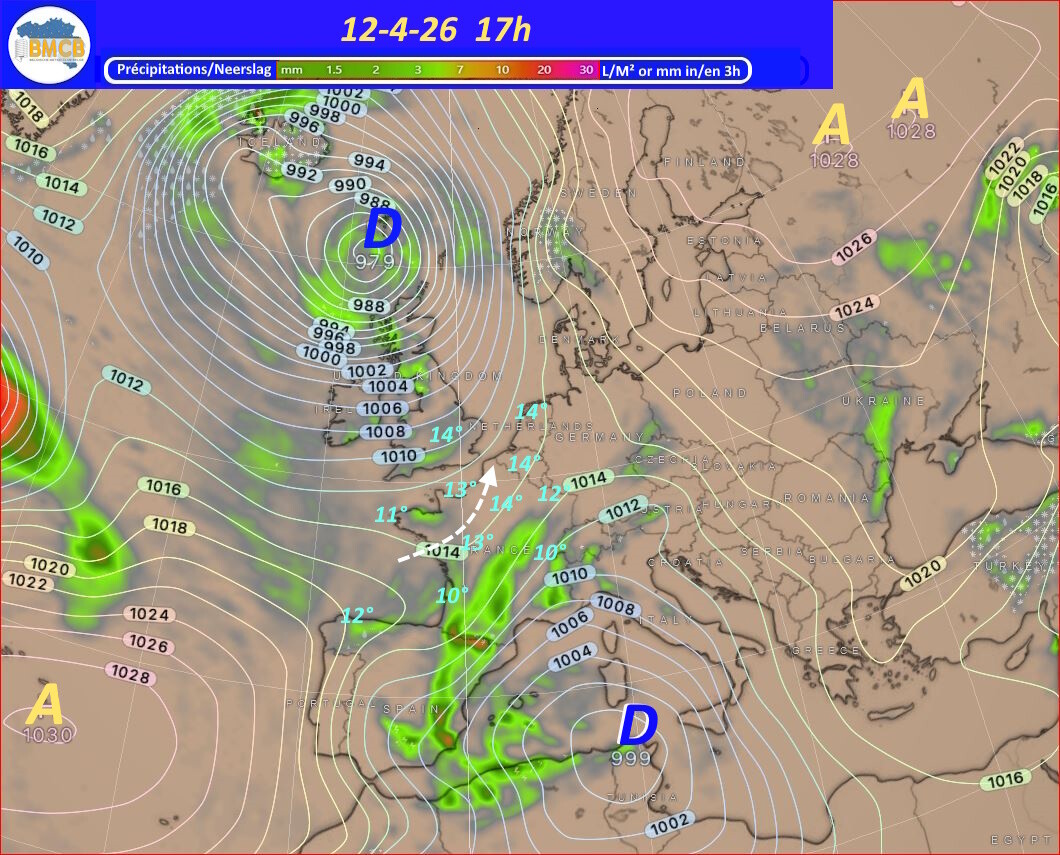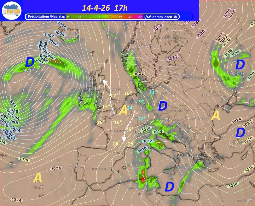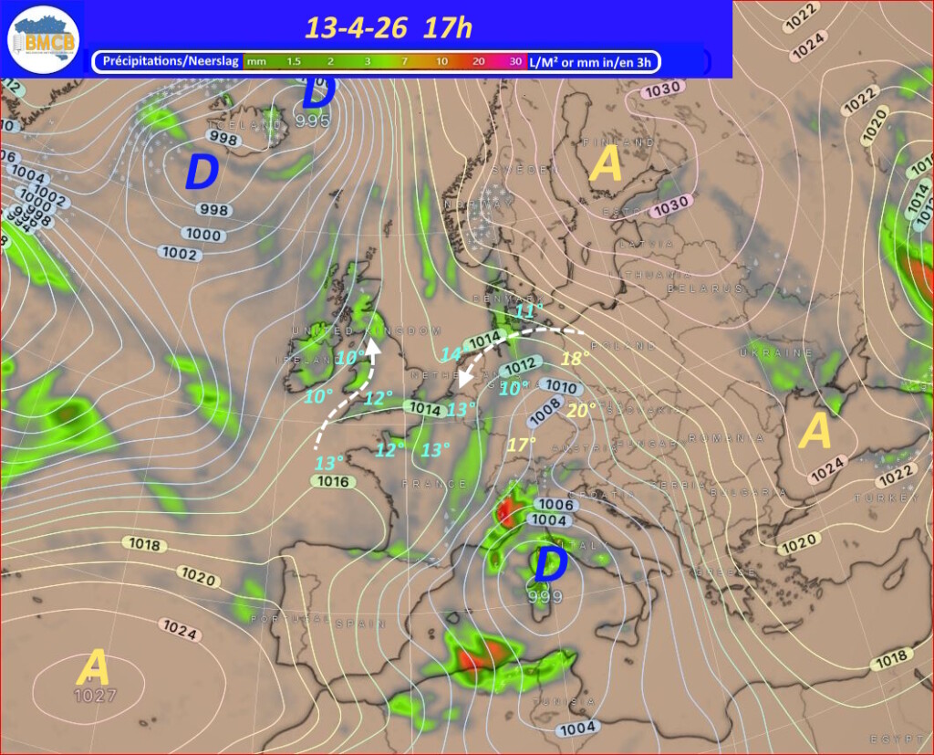 Vanaf dinsdag ontwikkelt zich echter een hogedrukrug van de Noordzee tot het zuiden van de Golf van Biskaje. Deze zorgt voor een geleidelijke stabilisatie van de atmosfeer, met drogere lucht en een dag na dag zachter wordend temperatuurverloop.