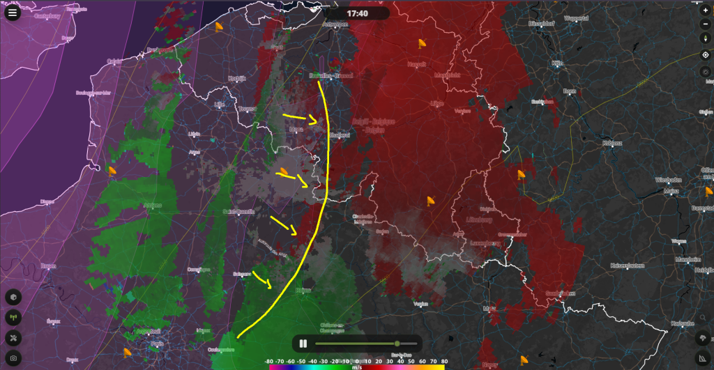Momenteel zie je het koufront passeren op de Avesnes radar site. Check de velocity images op Base elevation.