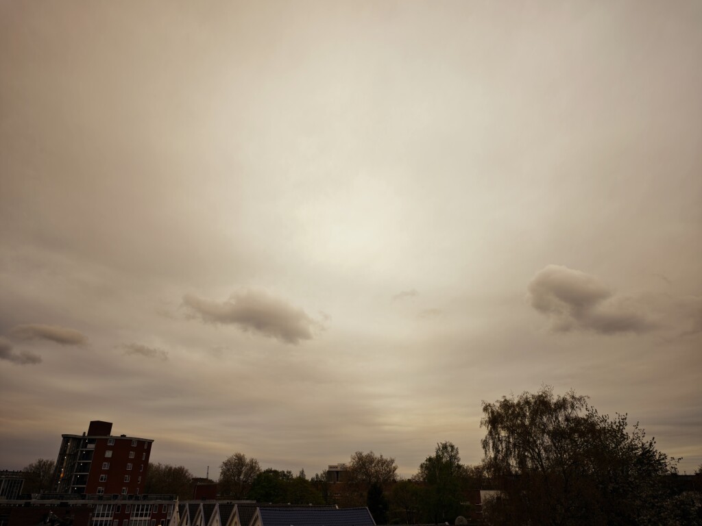 Een front dat maar 0.2 mm achterliet, hooguit kleine plasjes op het dak van onze zuidvleugel, nauwelijks om het stof te blussen, de lucht kleurt nu wel opvallend bruinig, wat surrealistische sfeer buiten nu