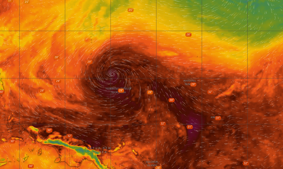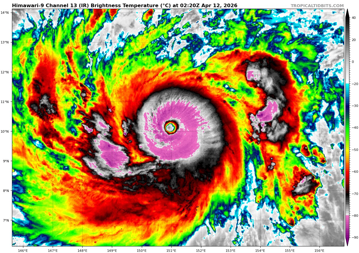 Gisteren zou 944mbar de pieksterkte zijn op het moment van passeren van Guam, over een dag of 2-3. Ineens is het heel hard gegaan met de aansterking, want nu is de 944mbar al bereikt. Momenteel is er ontzettend veel vocht voorhanden, de cycloon wordt omgeven door hoge dauwpunten van 25-26C met watertemperaturen van 29C. Een fors sterke cycloon voor zo vroeg in het seizoen.