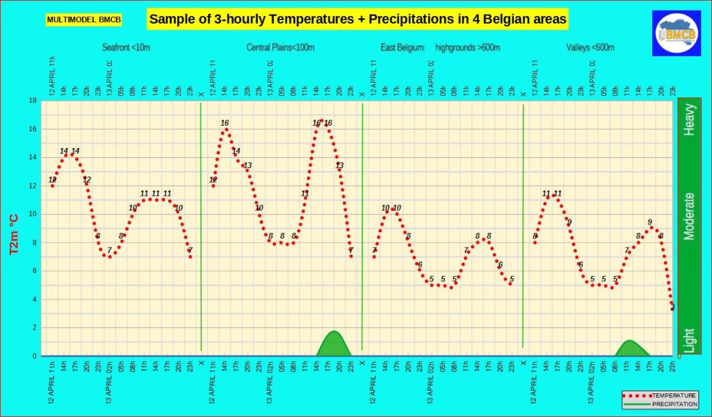 Maxima rond 14°C aan zee, 12 tot 16°C in het binnenland en 10 tot 11°C in de Hoge Ardennen.