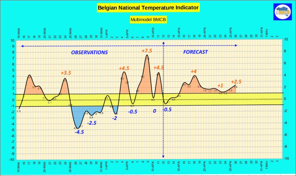 In de loop van de week zet een geleidelijke temperatuurstijging in. Tegen 18 april stijgt de nationale thermische index in België van 0 à -1 naar ongeveer +4, wat wijst op duidelijk zachtere omstandigheden.