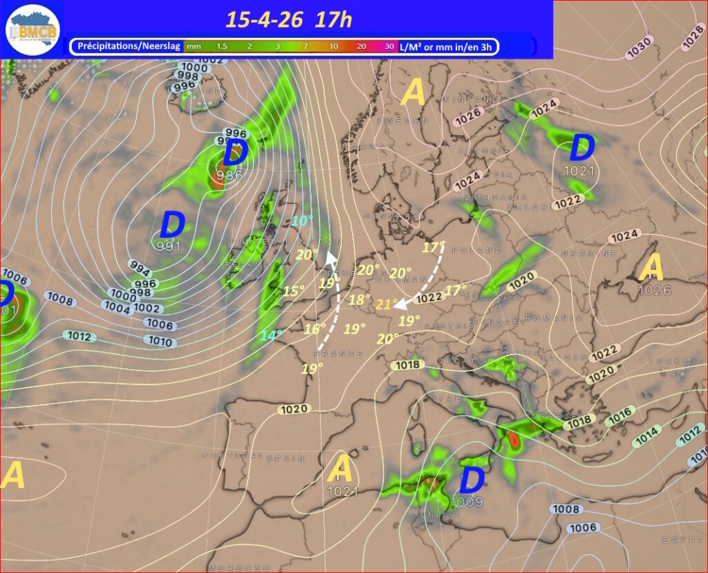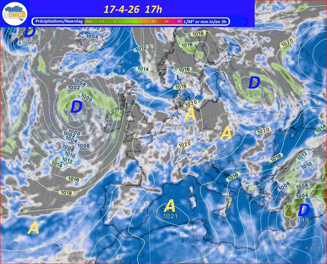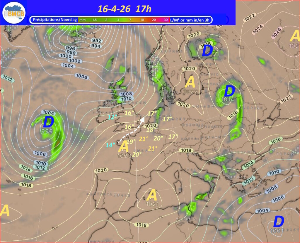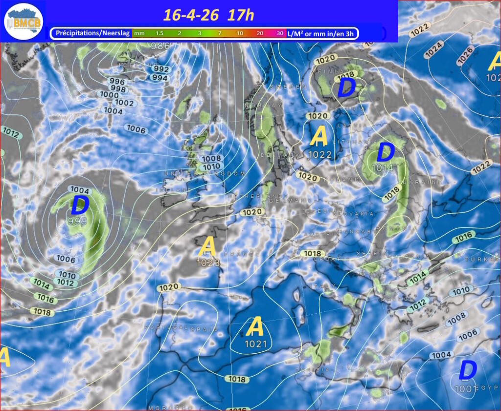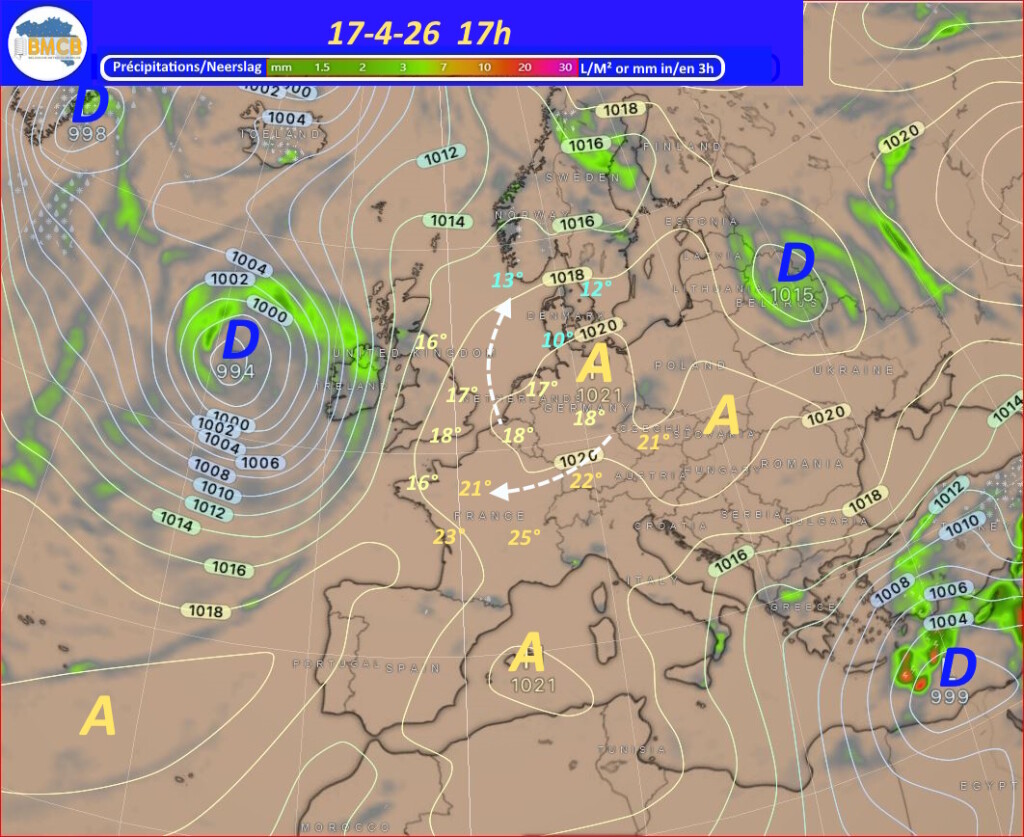 Voor de rest van de week trekken verschillende hogedrukkernen over het westen van Frankrijk, Duitsland en het zuiden van de Baltische Zee. Zwakke storingen van Bretagne naar Engeland en de Noordzee kunnen af en toe meer bewolking en lichte regen brengen, terwijl het zacht blijft voor het seizoen.