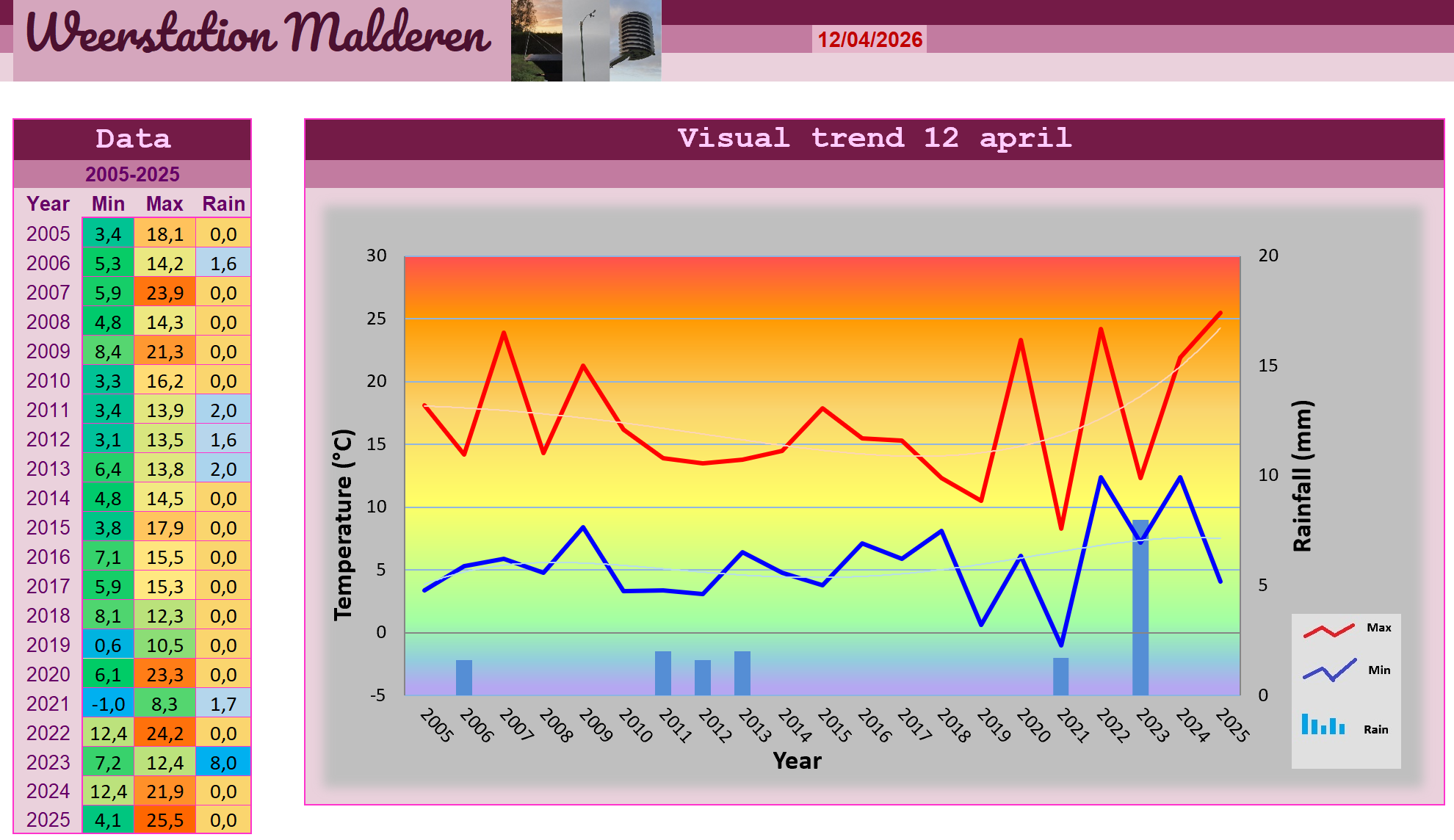 Het was vanochtend betrokken en de atmosfeer maakte door de sombere Stratus en Stratus fractusbewolking een stabiele indruk na de buien die kort na middernacht Malderen hebben overspoeld. Toch hadden we nog het een en ander voor de boeg vandaag, want het koufront zelf lag nog ten westen van ons terwijl er een heleboel buien klaarlagen om vervolgens de Lage Landen binnen te trekken. De frontale neerslag bereikte ons reeds voor zonsopgang en was erg pittig. Daarna ontstonden er opklaringen terwijl de amberkleurige schijn van de lucht plaats maakte voor luchtige blauw- en grijstinten. Het werd een paar uur rustig alvorens de buien ons bereikten die vooral uit regen en hagel bestonden. Doordat we tijdelijk in de linkeruitgang van een jetstreak lagen, maakten sommige buien er geen probleem van om ook wat donder en bliksem op het menu te zetten, maar voor hoever dat in Malderen het geval was is onbekend. De luchtdruk steeg snel vanuit het zuidwesten waardoor het tijdens de namiddag droog werd en de stapelwolken steeds kleiner werden. Nu was het echter de wind die voor de hoofdrol ging want deze wakkerde flink aan tot snelheden van 40,2 km/h uit het noord- noordwesten. De frisse maxima van 13,9 graden werden in deze omstandigheden natuurlijk maar al te duidelijk, al konden we nu gelukkig op extra zonneschijn rekenen. Tijdens de avond werden de stapelwolken tijdelijk weer groter maar het kwam niet tot regen, en ook de Stratocumulus wolkenbandjes die rond en na zonsondergang voorbij trokken bleken onschuldig te zijn. Buiten dit alles was er ook wat sluierbewolking te zien van regenzones die op veilige afstand ten zuiden en zuidwesten van ons bleven. Het koelde nu zeer snel af waardoor de minima pas 's avonds werden opgetekend met 3,4 graden. We sloten af met een neerslagtotaal van 2,0 mm.