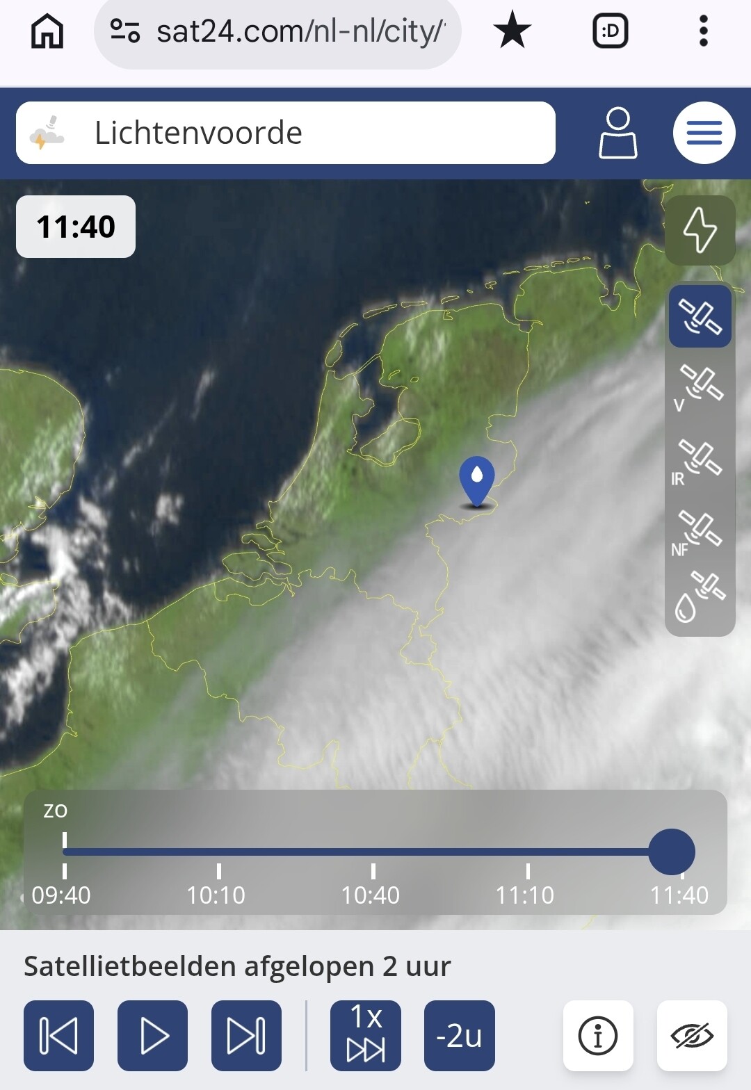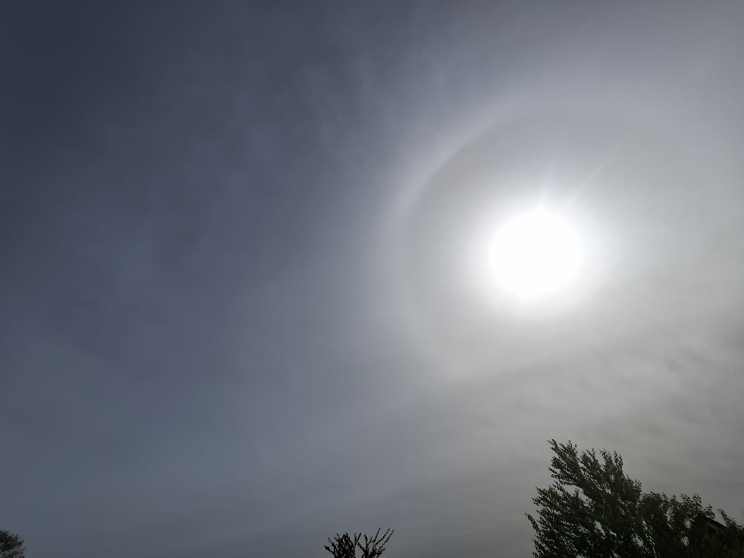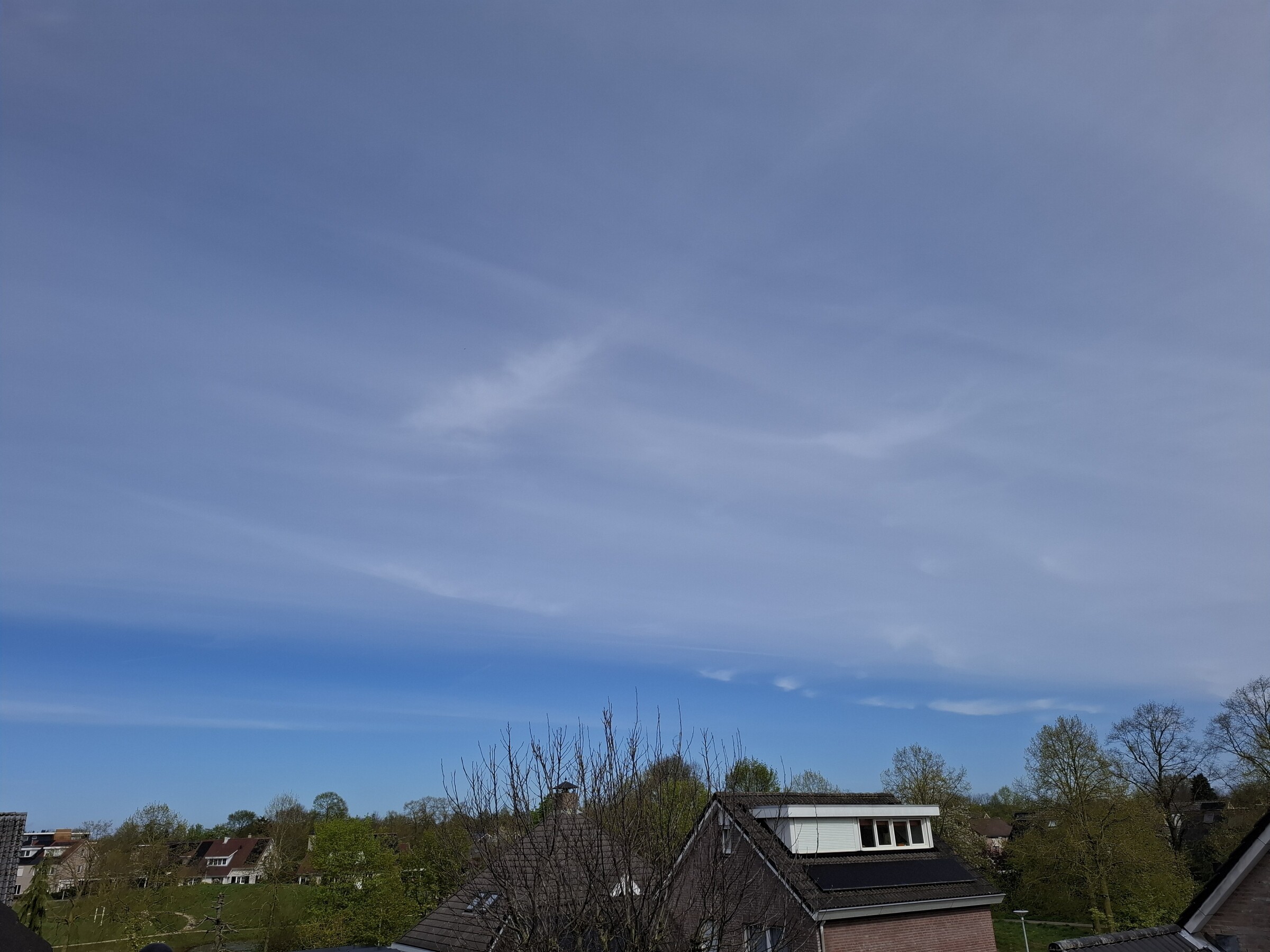 Kijkend naar het westnoordwesten zie je de scheidingslijn hoge bewolking en onbewolkt weer. Tevens hier een deel van een halo zichtbaar.